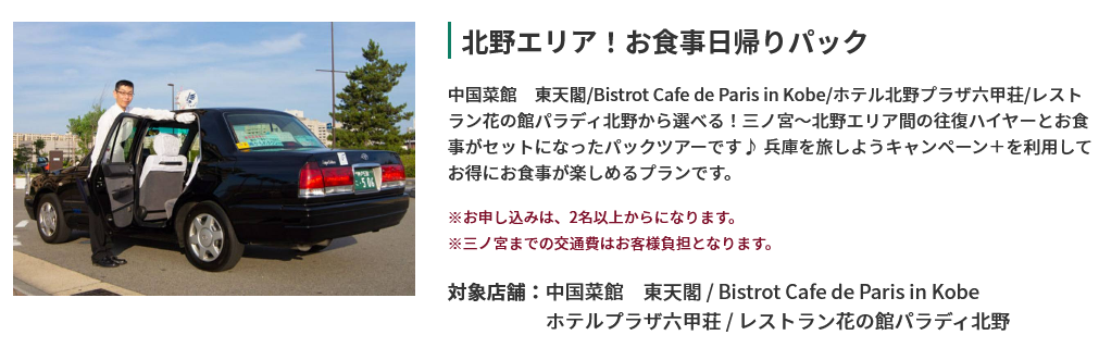中国菜館 東天閣/Bistrot Cafe de Paris in Kobe/ホテル北野プラザ六甲荘/レストラン花の館パラディ北野から選べる!三ノ宮~北野坂エリア間の往復ハイヤーとお食事がセットになったパックツアーです♪ ひょうごを旅しようキャンペーン+を利用してお得にお食事が楽しめるプランです。