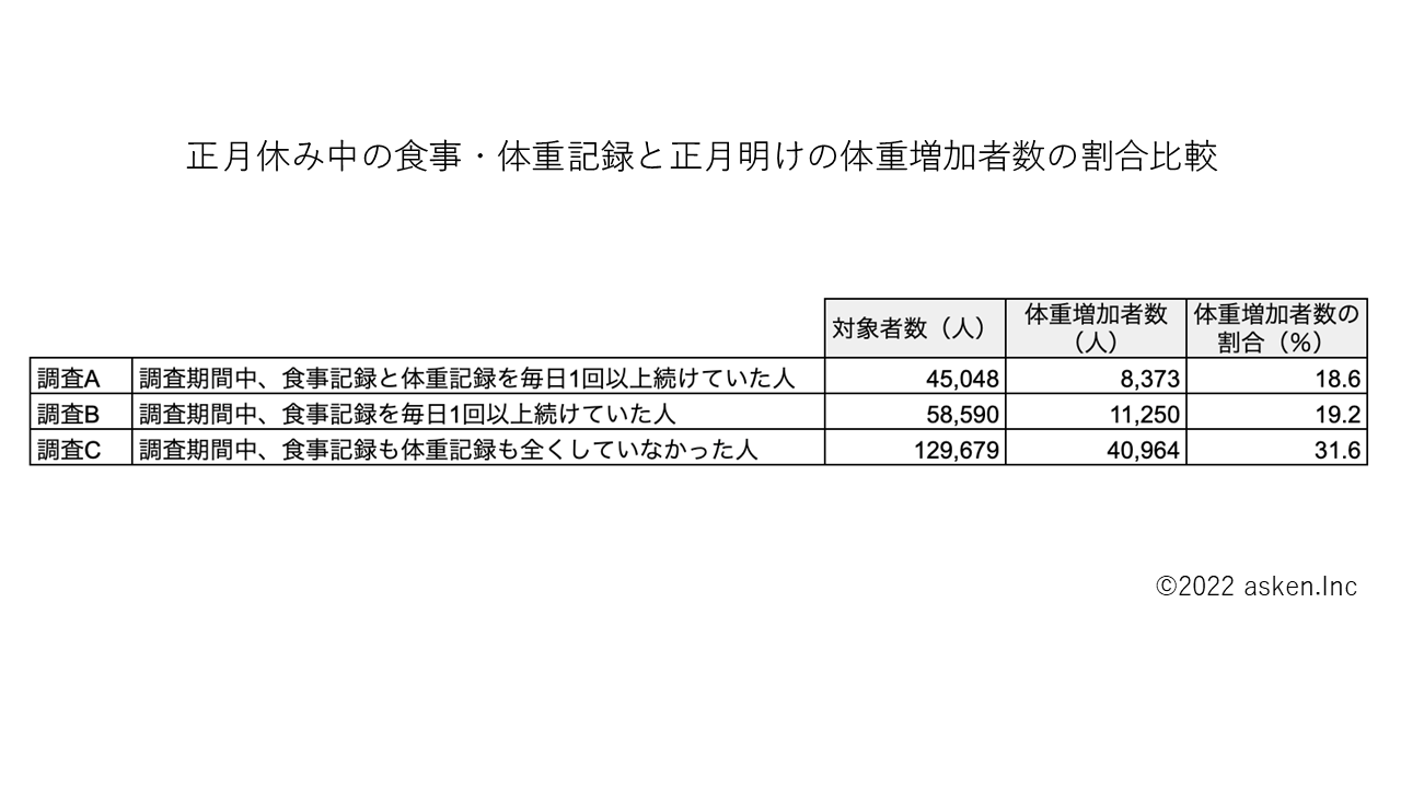 累計会員数800万人超*¹、国内No.1*²のAI食事管理アプリ『あすけん』の開発・運営を行う株式会社asken(東京都新宿区、代表取締役社長 中島洋、以下「当社」)は、ユーザーが記録した2021年12月から2022年1月のデータを集計し、食事・体重記録行動と正月休み中の体重変化の関係について調査いたしました。