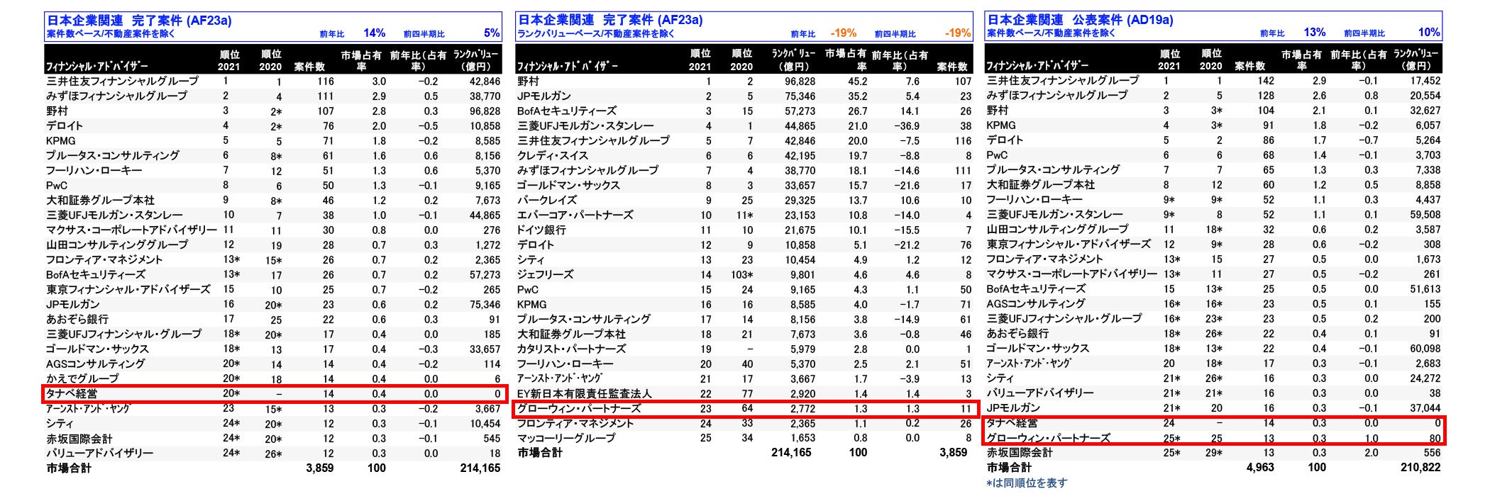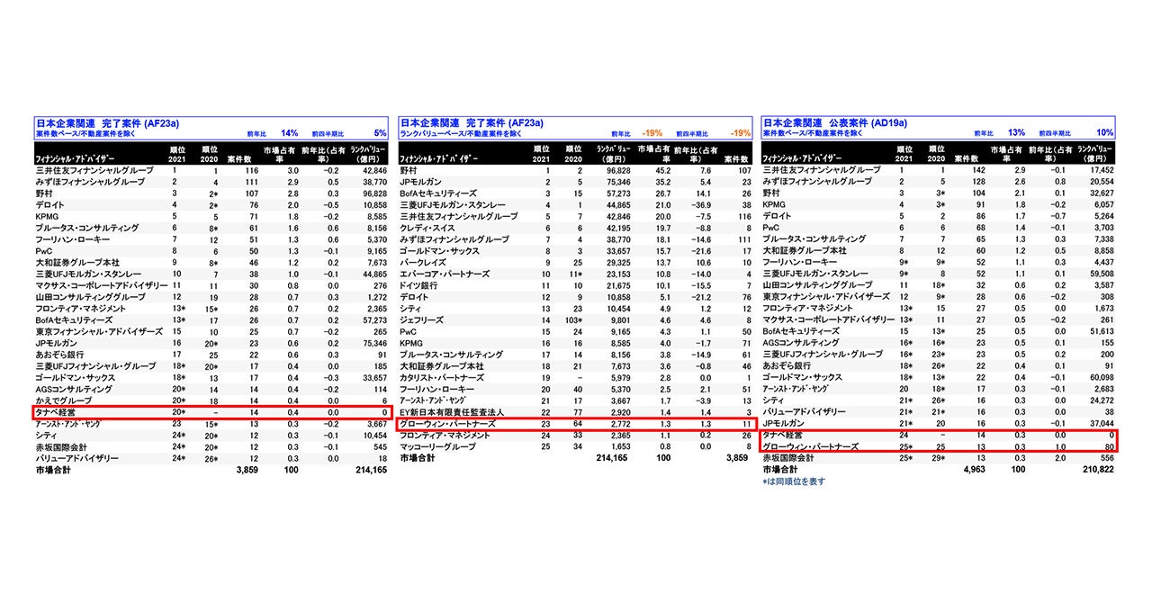 タナベコンサルティンググループ(タナベ経営、グローウィン・パートナーズ)、リフィニティブが発表する2021年「日本M&Aレビュー」にランクイン