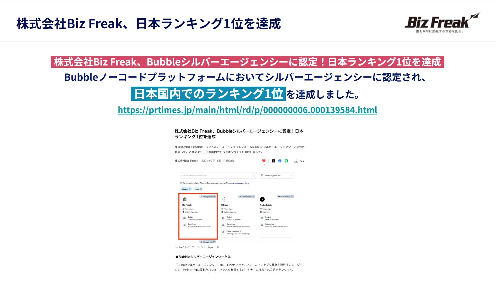 ノーコード・プラットフォーム「Bubble」においてパートナー日本ランキング1位を獲得したBizFreakとNoCodeCampが、本イベントを機に本格連携を開始。
