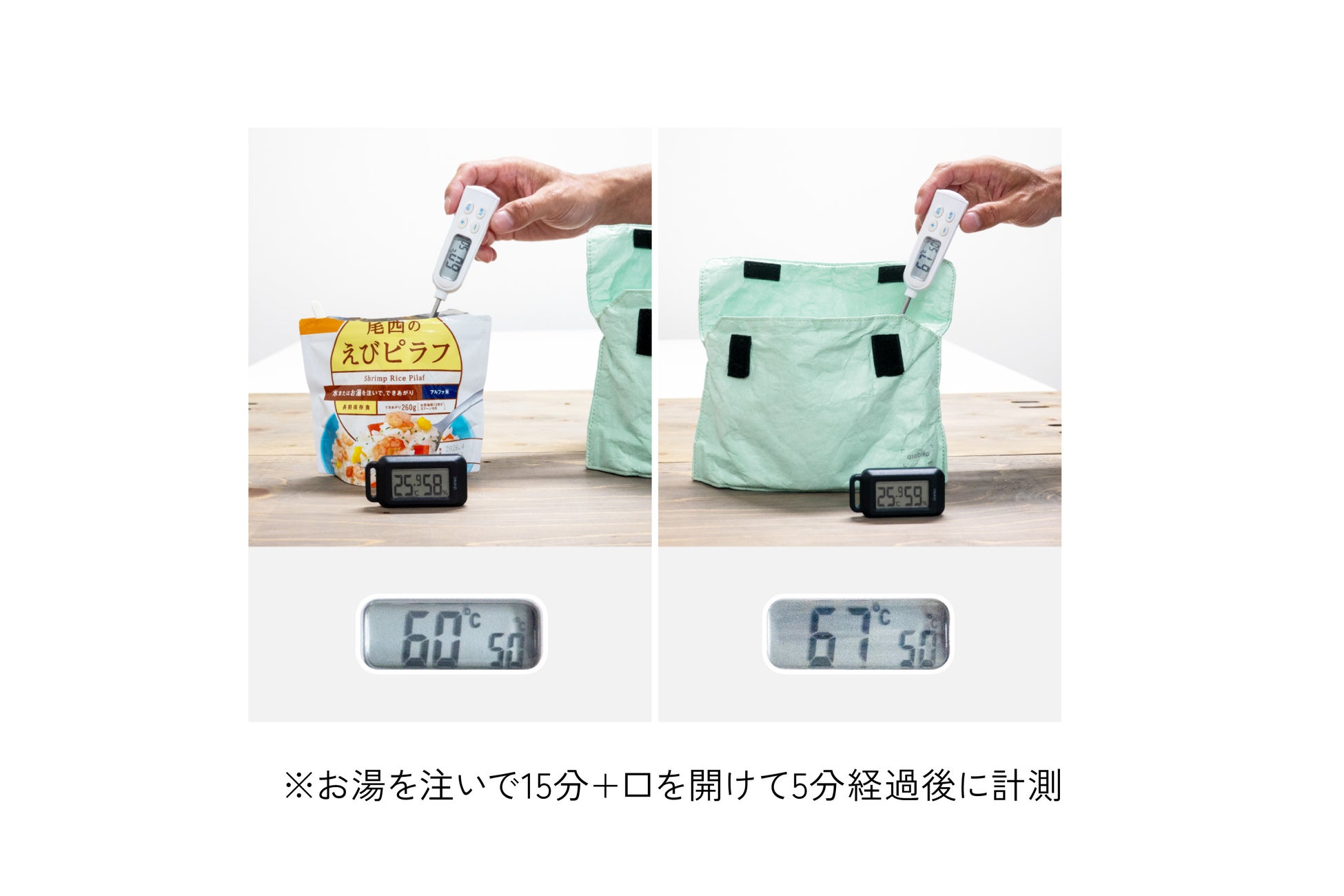 1食分のコジーより大きめに作られていても、20分経過後のアルファ化米の温度はサーモポーチの有無でしっかりと差が出ます。