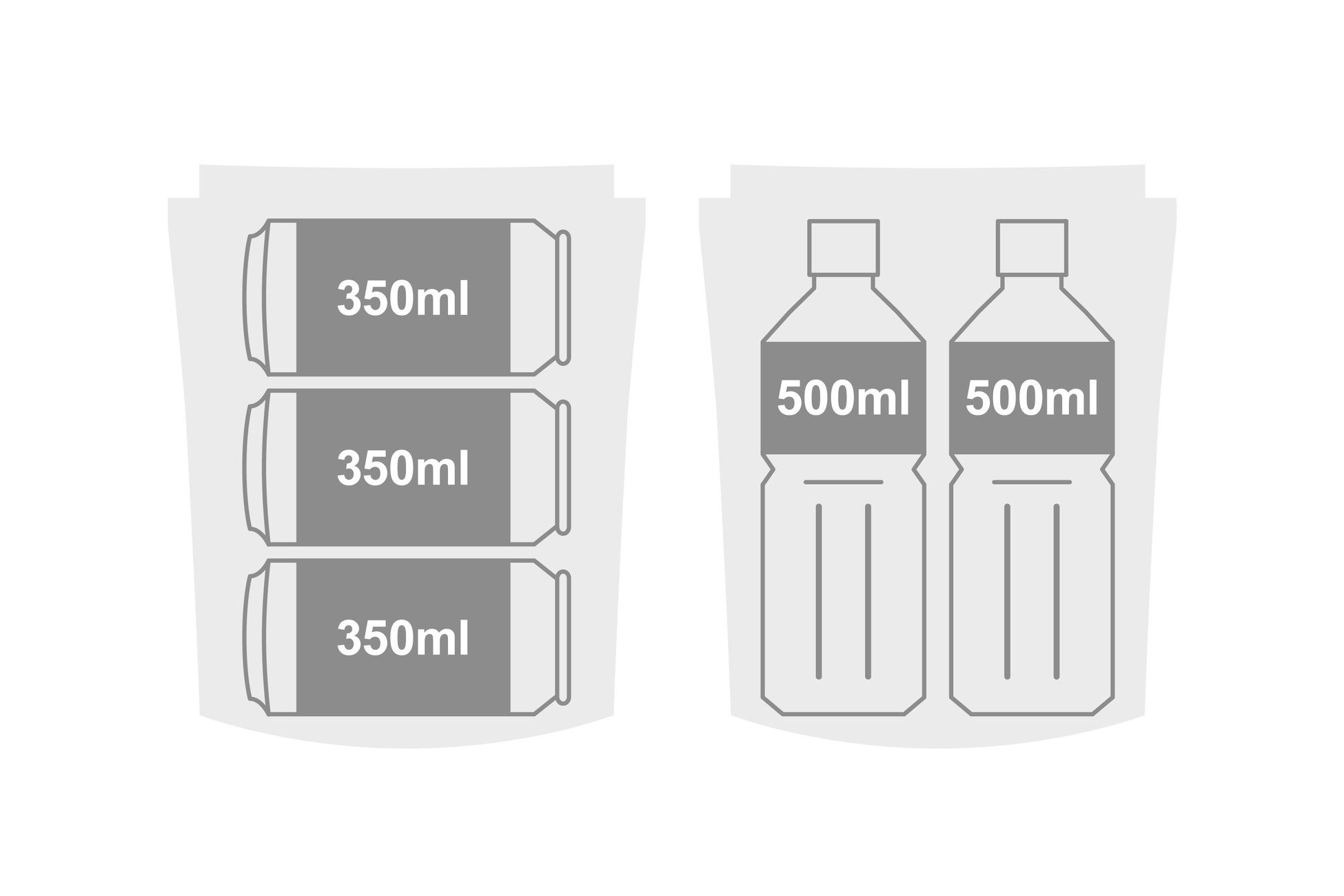 500mL缶や500mLペットボトルは縦に並べて2本、350mL缶は横に並べて3本収納可能です。マチがあるため食品も1食分は収納可能です。