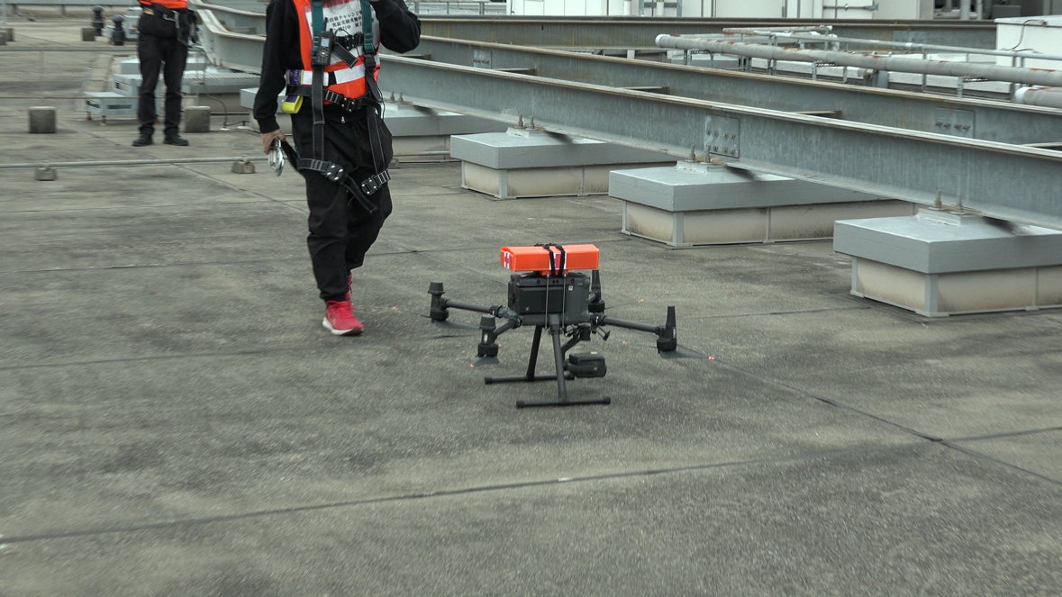 ・屋上に係留装置を設置し、ドローンを接続することで万が一の際の落下を防ぎ、電波状況やビル風の影響を確認