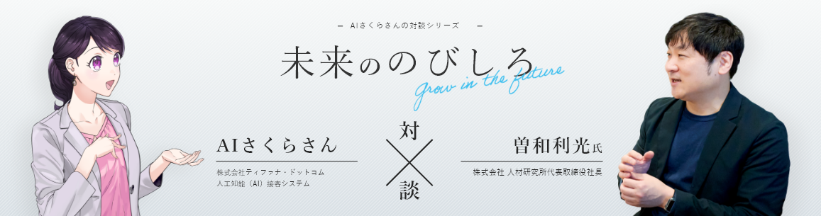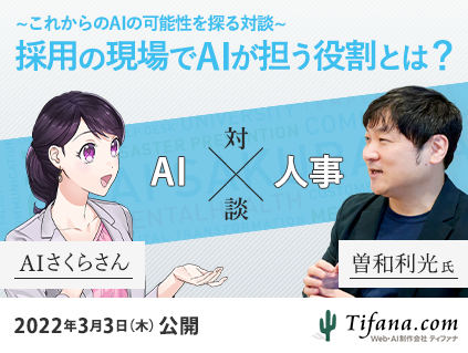 株式会社ティファナ・ドットコム(本社:東京都目黒区、代表取締役社長:藤井亮)が提供している人工知能(AI)接客システム「AIさくらさん」(https://tifana.ai/)との対談シリーズ「未来ののびしろ」にて、人事コンサルタントの曽和利光さんと行った「人事×AI」をテーマにした対談の模様を2022年3月3日(木)より公開しました。