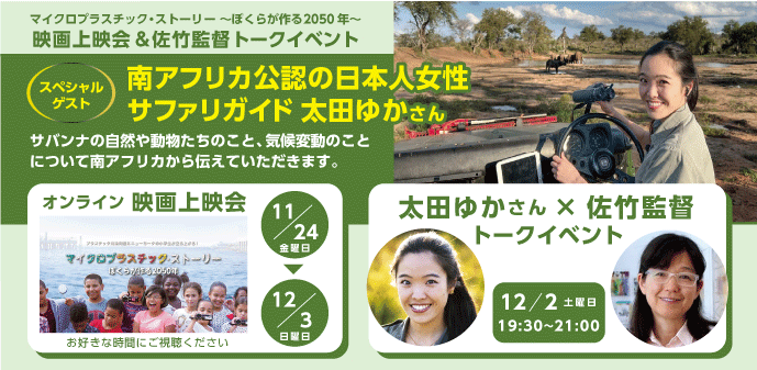 映画「マイクロプラスチック・ストーリー~ぼくらが作る2050年~」は、ニューヨーク、ブルックリンの5年生たちが世界的に大きなプラスチック汚染問題を学び、彼らの視点でこの問題の根幹が何かを問いただし、解決に向かって自分たちのコミュニティーからアクションを広げて行ったドキュメンタリーです。今回は、この映画の日本語吹替版を鑑賞するとともに、スペシャルゲストに南アフリカ公認日本人女性サファリガイド 太田ゆかさんをお招きし、ニューヨーク在住の佐竹監督とをつないで、サバンナの素晴らしさと環境問題に触れプラスチック汚染問題との関係を考えます。