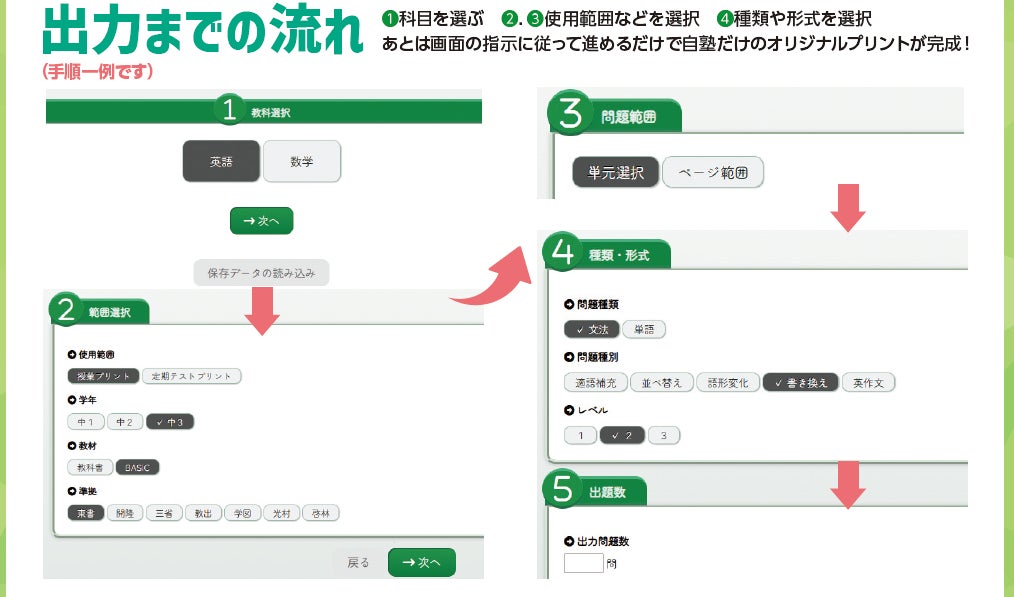 ”授業プリント” や ”テスト対策” として中学生向けプリントが出力できる、