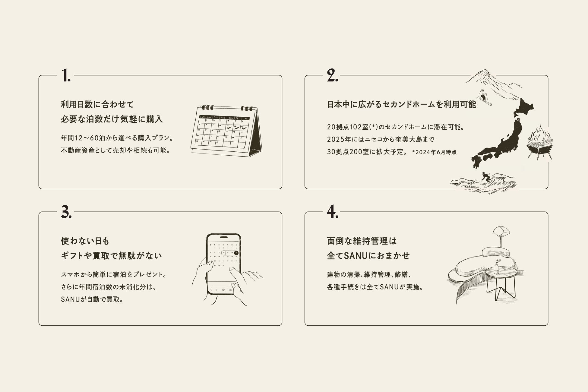 また、自身の所有物件以外の日本各地の美しい自然に広がるSANU 2nd Home(20拠点102室/2024年6月時点)も利用することができます。