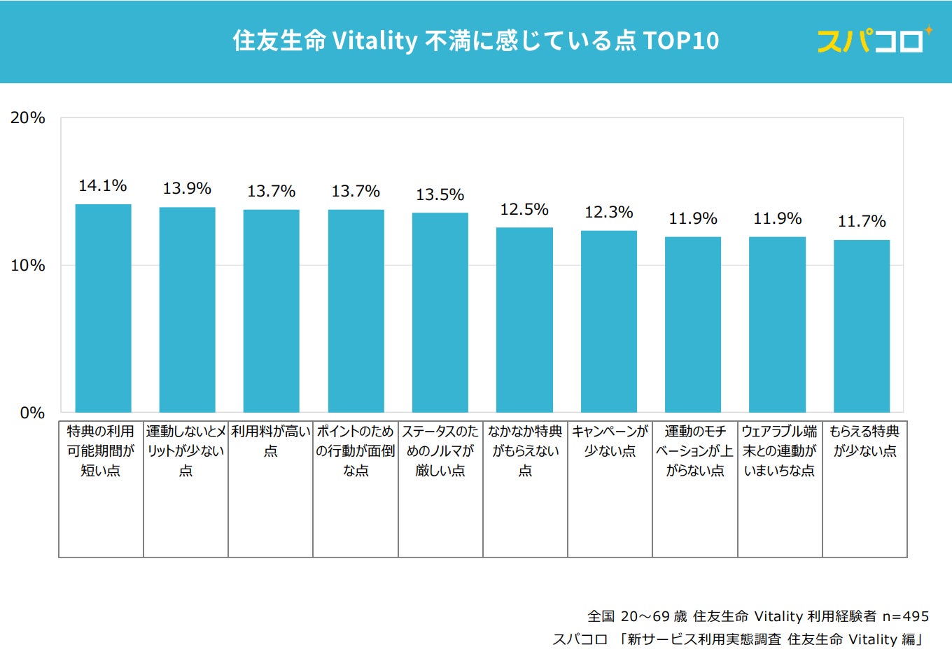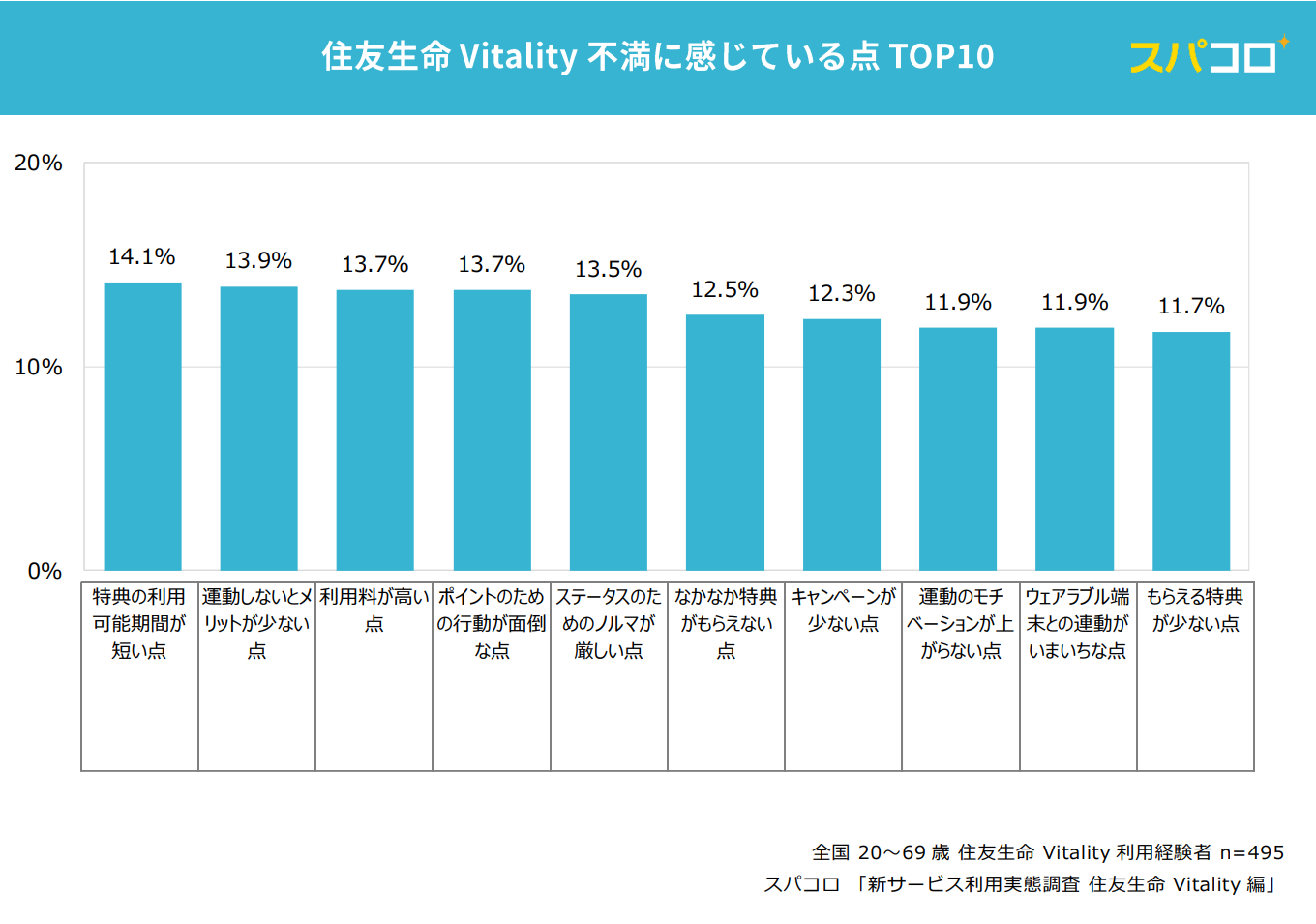 住友生命 Vitalityについて不満に感じている点は上位から「特典の利用可能期間が短い点」(14.1%)、「運動しないとメリットが少ない点」(13.9%)、「利用料が高い点」「ポイントのための行動が面倒な点」(各13.7%) となりました。