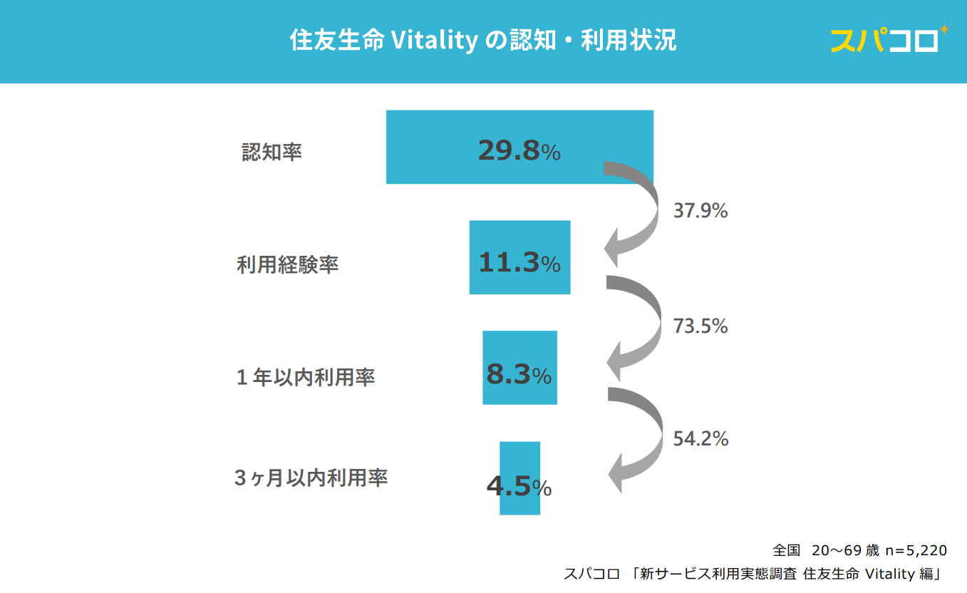 顧客理解と市場把握の可視化をまるっとサポートするリサーチツール『スパコロ』を提供する株式会社スパコロ(本社:東京都港区、代表取締役社長:林 秀紀)は、全国20~69歳の5,220名を対象に「新サービス利用実態調査 住友生命 Vitality編」を実施したので、ご報告いたします。
