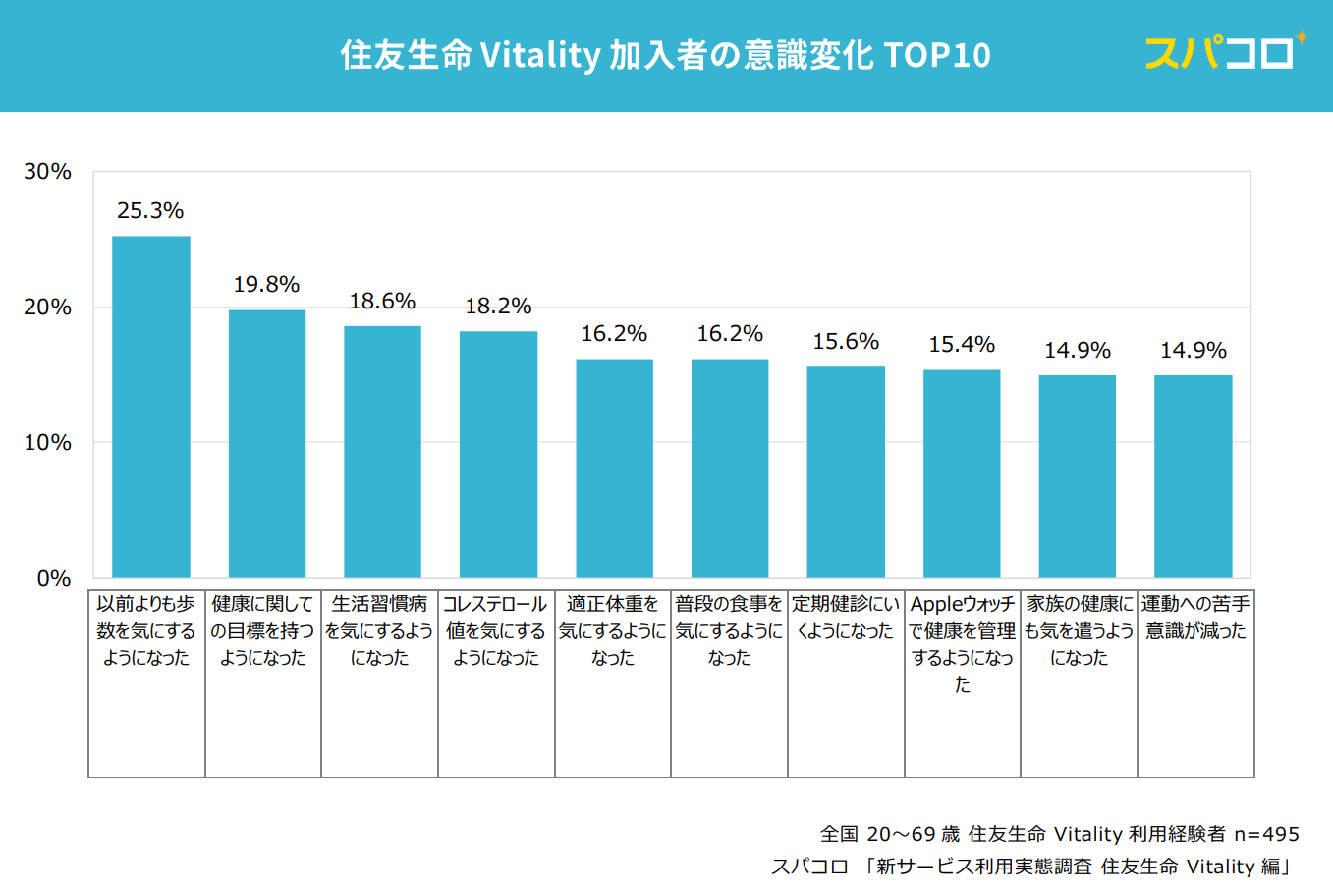 住友生命 Vitality加入経験者は、サービス加入後にどのような健康意識における変化があったのでしょうか?上位から、「以前よりも歩数を気にするようになった」(25.3%)、「健康に関しての目標を持つようになった」(19.8%)、「生活習慣病を気にするようになった」(18.6%)、「コレステロール値を気にするようになった」(18.2%)という結果となりました。歩数はポイントに直接反映されるため、特に意識するようになる人が増えたことがわかります。