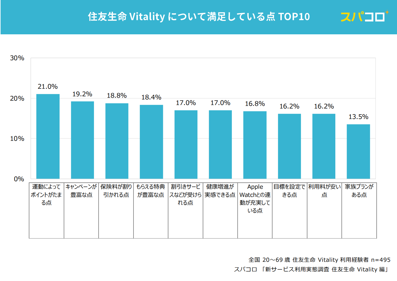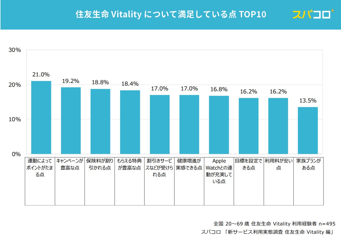 住友生命 Vitalityについて満足している点は上位から「運動によってポイントがたまる点」(21.0%)、「キャンペーンが豊富な点」(19.2%)、「保険料が割り引かれる点」(18.8%)、「もらえる特典が豊富な点」(18.4%) でした。健康を維持したい人が加入していると考えられるため、運動によってポイントが貯まることはメリットとして大きいという結果となりました。