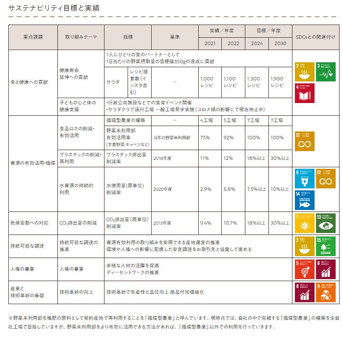 サラダクラブでは、キユーピーグループの経営方針に則り、「社会・地球環境への貢献」というスローガンのもと、国連の持続可能な開発目標(SDGs)を参考に「食と健康への貢献」「資源の有効活用・循環」「気候変動への対応」を含む6つを重点課題として掲げ、サステナビリティに関する取り組みを強化しています。今回、それぞれの重点課題における取り組みテーマを一覧化して新たに2030年までに達成する目標を設定し、これまでの実績を開示しました。
