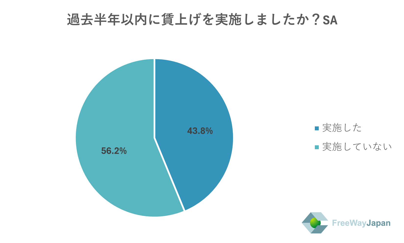 代表取締役の方に、過去半年以内に賃上げを実施したか聞いたところ、「実施していない」が56.2%、「実施した」が43.8%という結果だった。
