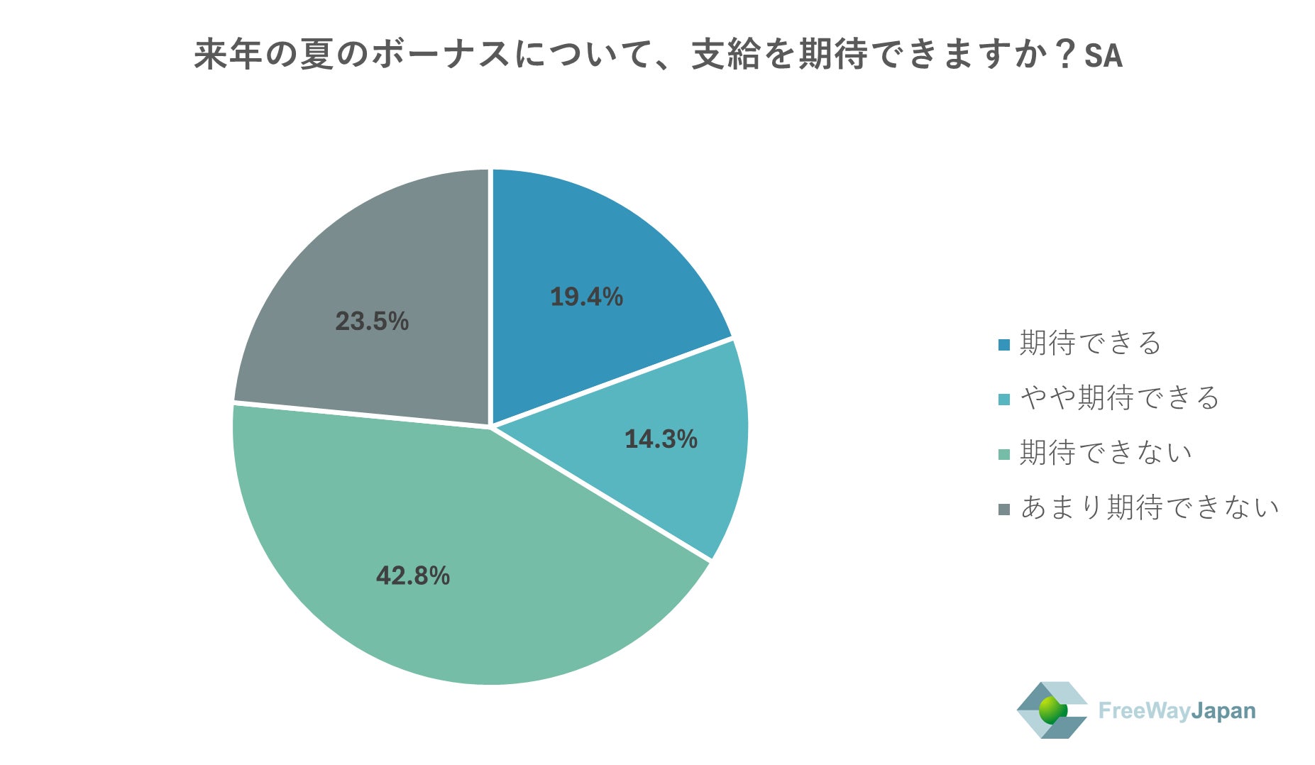 従業員の方に、来年の夏のボーナスについて支給を期待できるか聞いたところ、「期待できない」が42.8%、「あまり期待できない」が23.5%、「期待できる」が19.4%。「やや期待できる」が14.3%という結果だった。