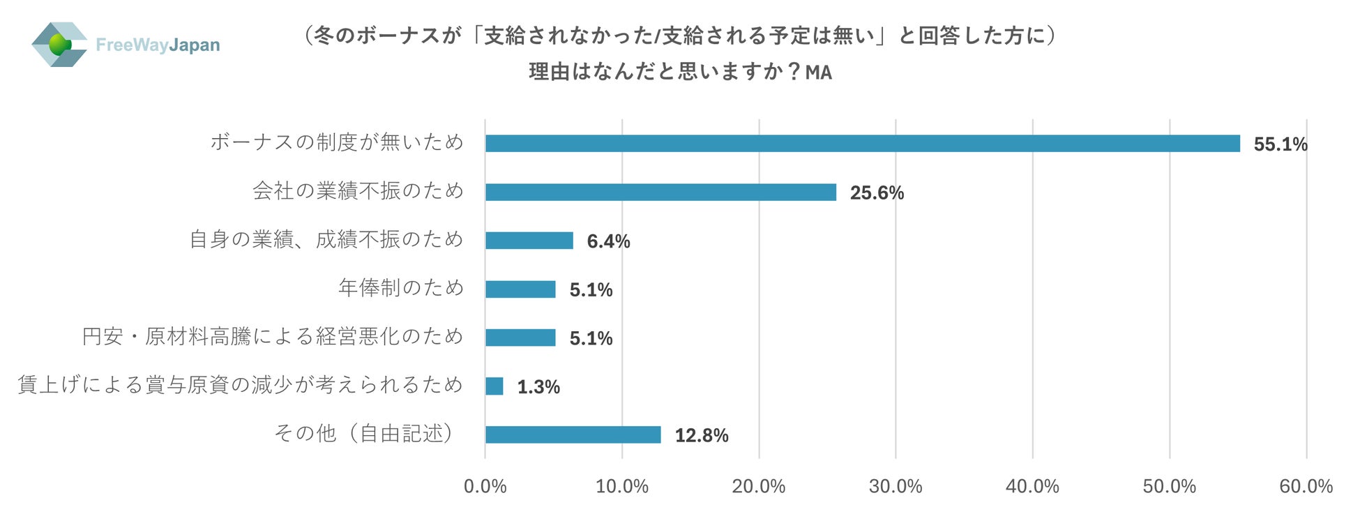 上記で「支給されなかった/支給される予定は無い」と回答した方に、その理由はなんだと思うか聞いたところ、「ボーナスの制度が無いため」が55.1%、「会社の業績不振のため」が25.6%、「自身の業績、成績不振のため」が6.4%、「年俸制のため」「円安・原材料高騰による経営悪化のため」がそれぞれ5.1%、「賃上げによる賞与原資の減少が考えられるため」が1.3%、その他(自由記述)が12.8%という結果だった。