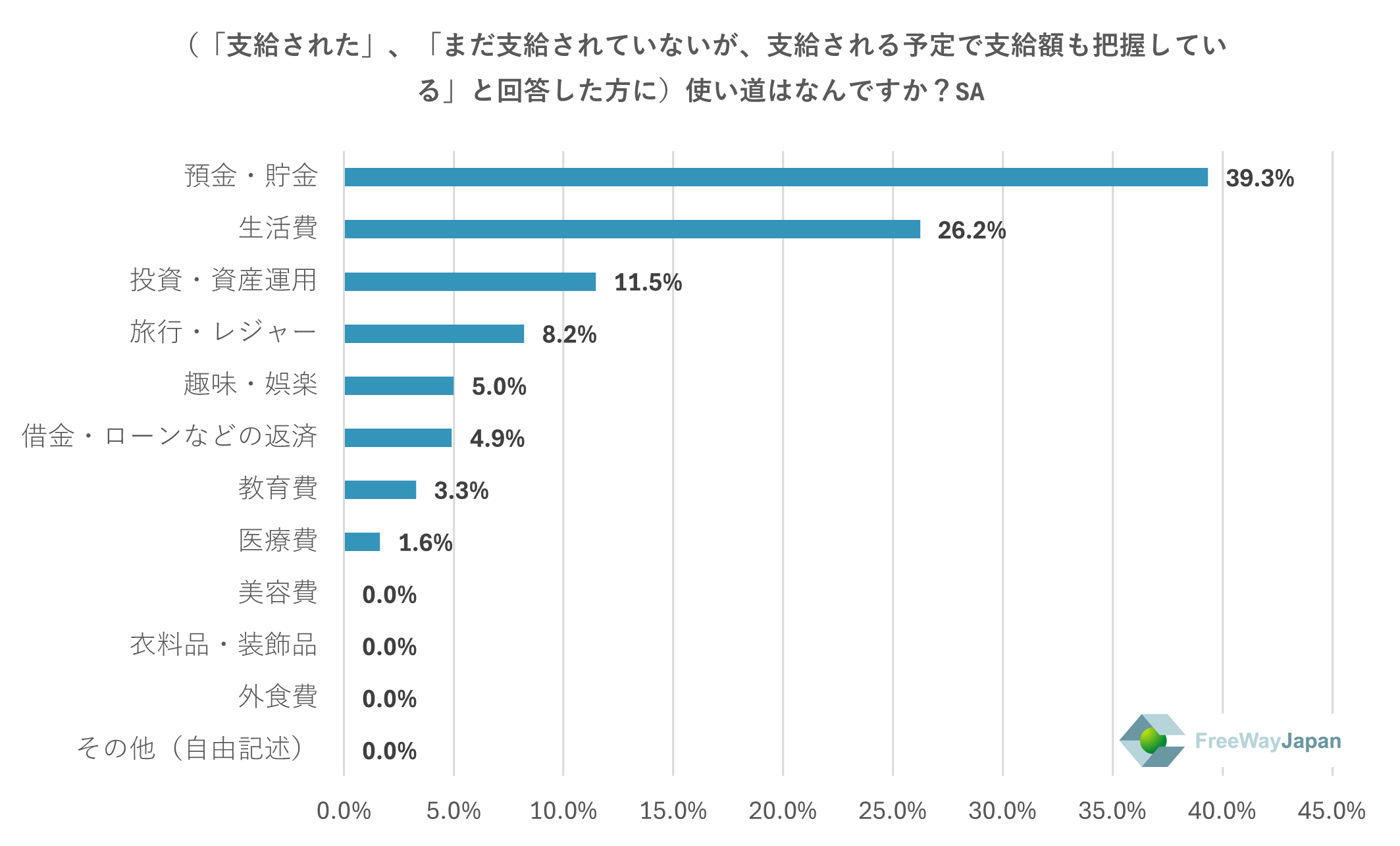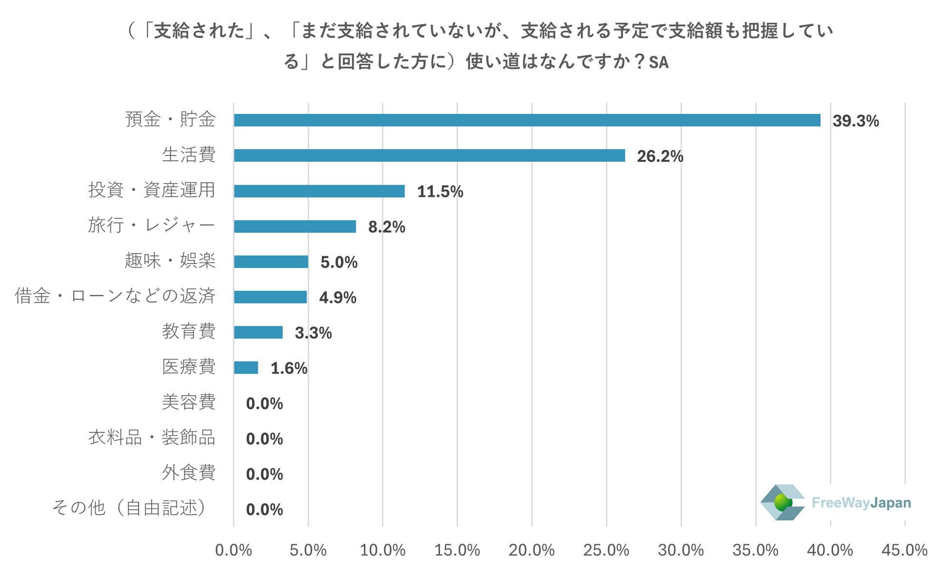 「支給された」、「まだ支給されていないが、支給される予定で支給額も把握している」と回答した方に、使い道を聞いたところ、「預金・貯金」が39.3%、「生活費」が26.2%、「投資・資産運用」が11.5%、「旅行・レジャー」が8.2%、「趣味・娯楽」が5.0%、「借金・ローンなどの返済」が4.9%と続いた。