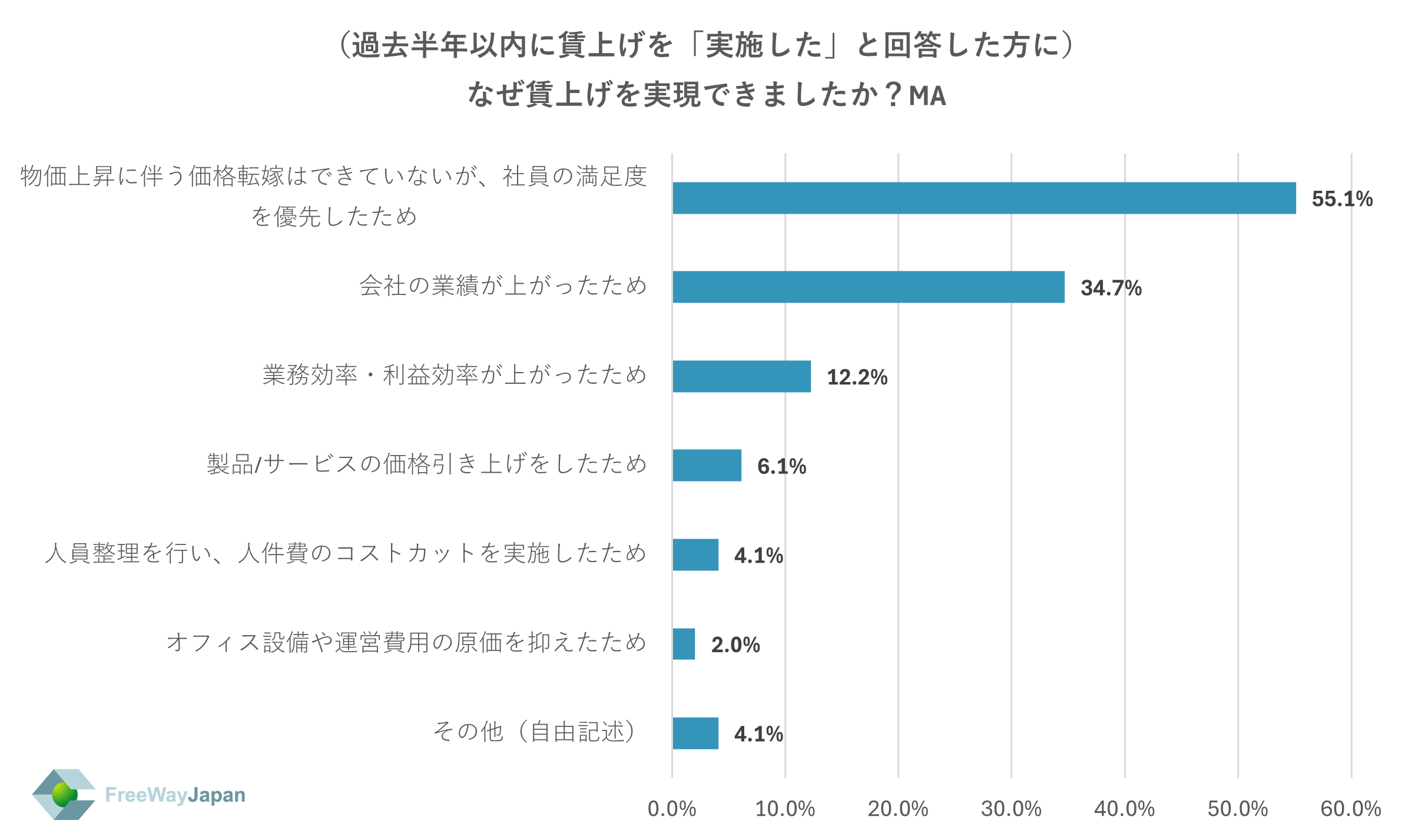 賃上げを「実施した」と回答した方に、なぜ賃上げを実現できたか聞いたところ、「物価上昇に伴う価格転嫁はできていないが、社員の満足度を優先したため」が55.1%、「会社の業績が上がったため」が34.7%、「業務効率・利益効率が上がったため」が12.2%、「製品/サービスの価格引き上げをしたため」が6.1%、「人員整理を行い、人件費のコストカットを実施したため」が4.1%、「オフィス設備や運営費用の原価を抑えたため」が2.0%、その他(自由記述)が4.1%という結果だった。