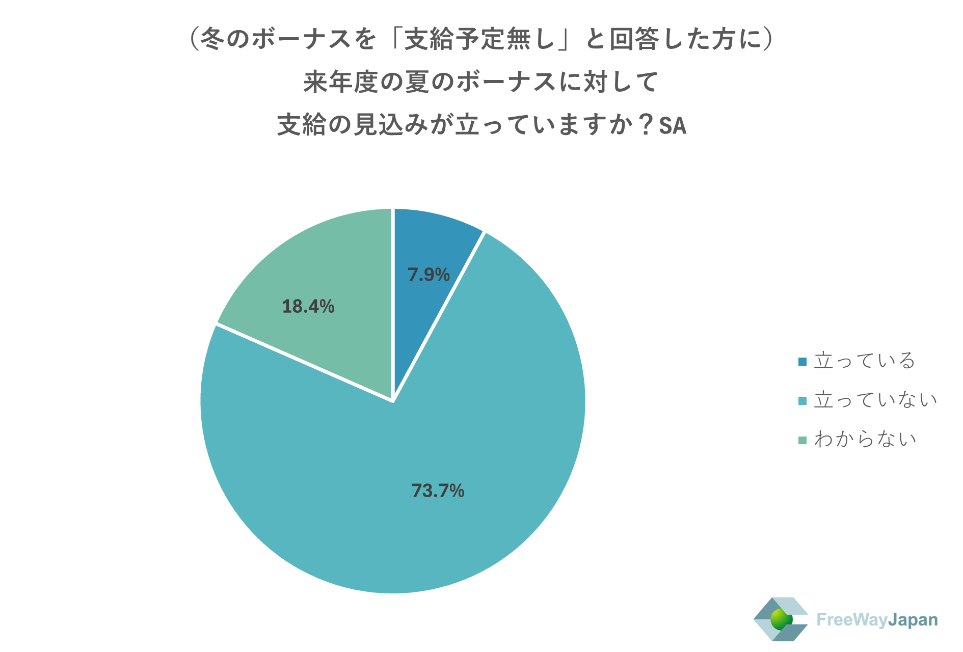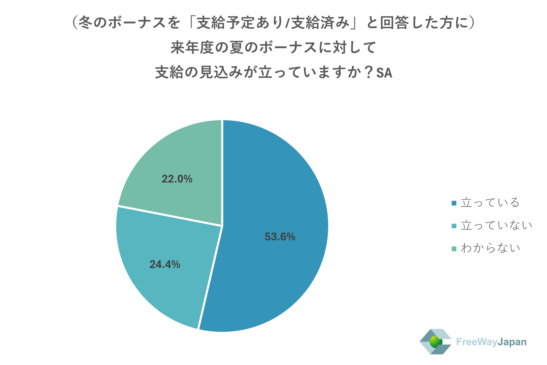 また、上記区分けにおいて、来年度の夏のボーナスに対する支給の見込みについての回答結果を見ると、冬のボーナスを「支給予定あり/支給済み」と回答した方は「立っている」が53.6%、「立っていない」が24.4%、「わからない」が22.0%だった。一方で冬のボーナスを「支給予定無し」と回答した方においては、「立っていない」が73.7%、「わからない」が18.4%、「立っている」が7.9%という結果だった。