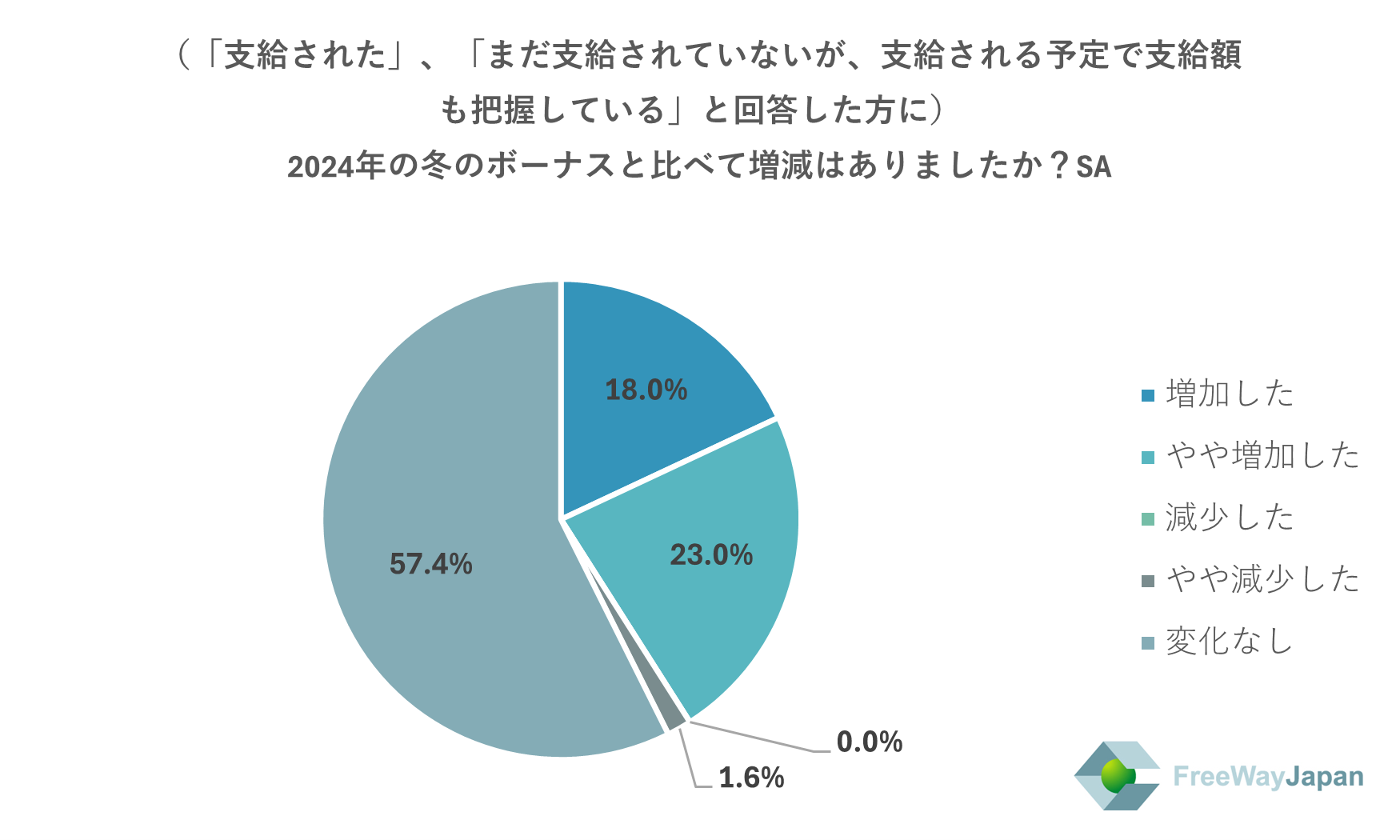 また、上記対象者に2024年の冬のボーナスと比べて増減はあったか聞いたところ、「変化なし」が57.4%、「やや増加した」が23.0%、「増加した」が18.0%、「やや減少した」が1.6%という結果だった。