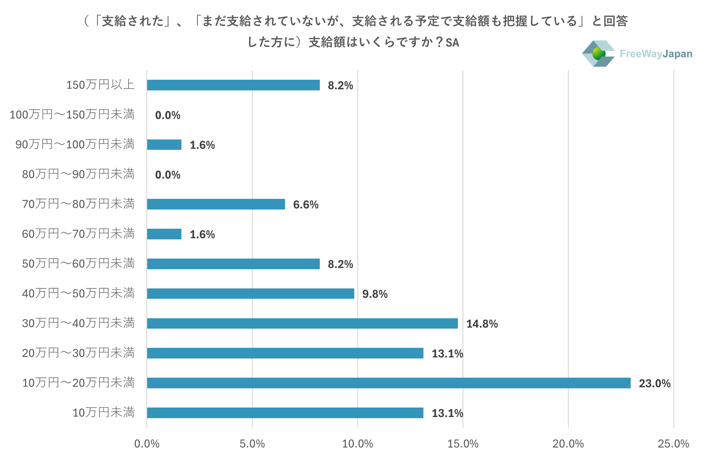 上記で「支給された」、「まだ支給されていないが、支給される予定で支給額も把握している」と回答した方に、支給額を聞いたところ、最多は「10万円~20万円未満」で23.0%、続いて「30万円~40万円未満」が14.8%、「10万円未満」「20万円~30万円未満」がそれぞれ13.1%、「40万円~50万円未満」が9.8%と続いた。回答者の平均額(※)は41.3万円だった。
