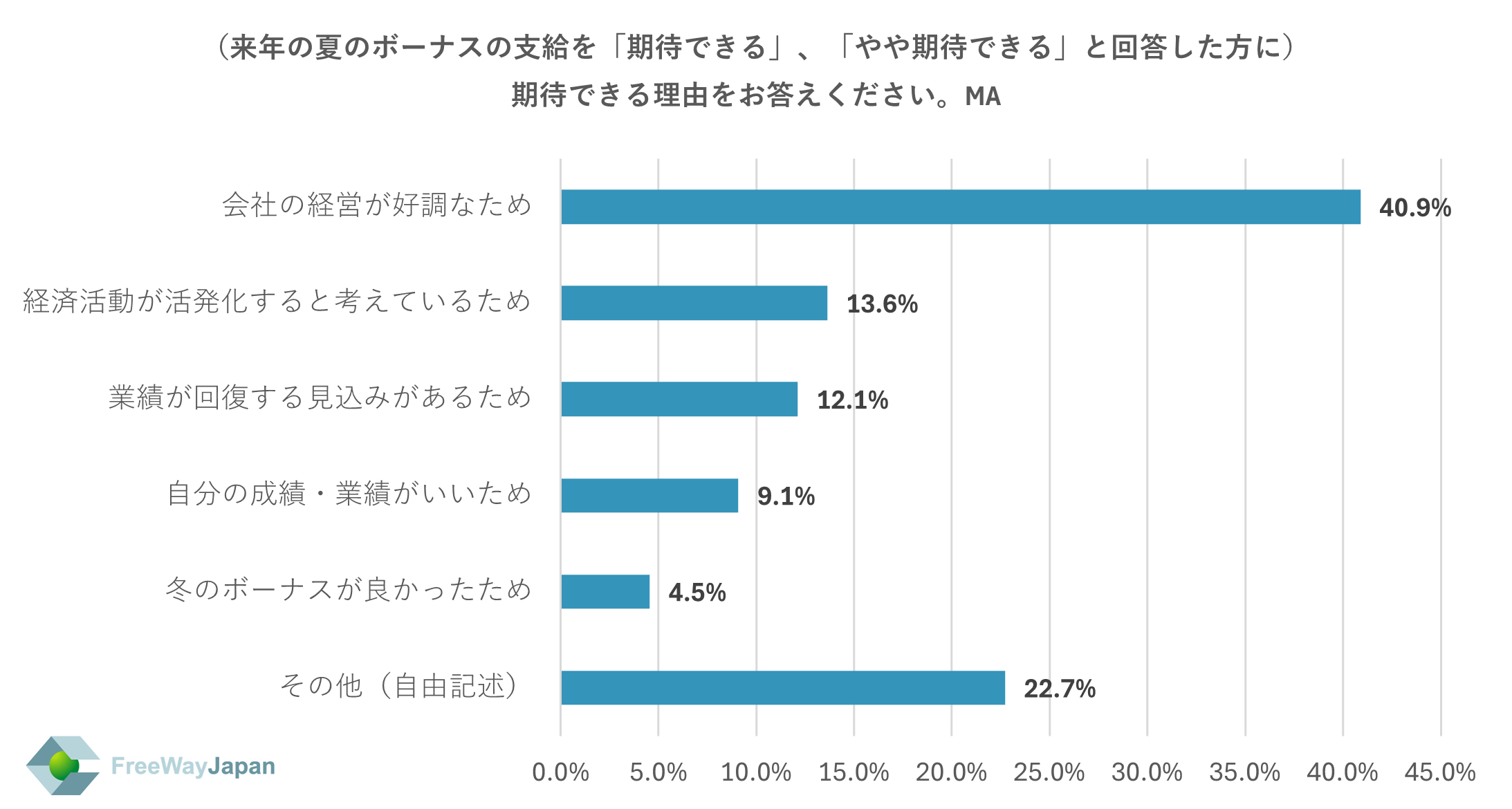 「期待できる」、「やや期待できる」と回答した方に、期待できる理由を聞いたところ、「会社の経営が好調なため」が40.9%、「経済活動が活発化すると考えているため」が13.6%、「業績が回復する見込みがあるため」が12.1%、「自分の成績・業績がいいため」が9.1%、「冬のボーナスが良かったため」が4.5%、その他(自由記述)が22.7%という結果だった。