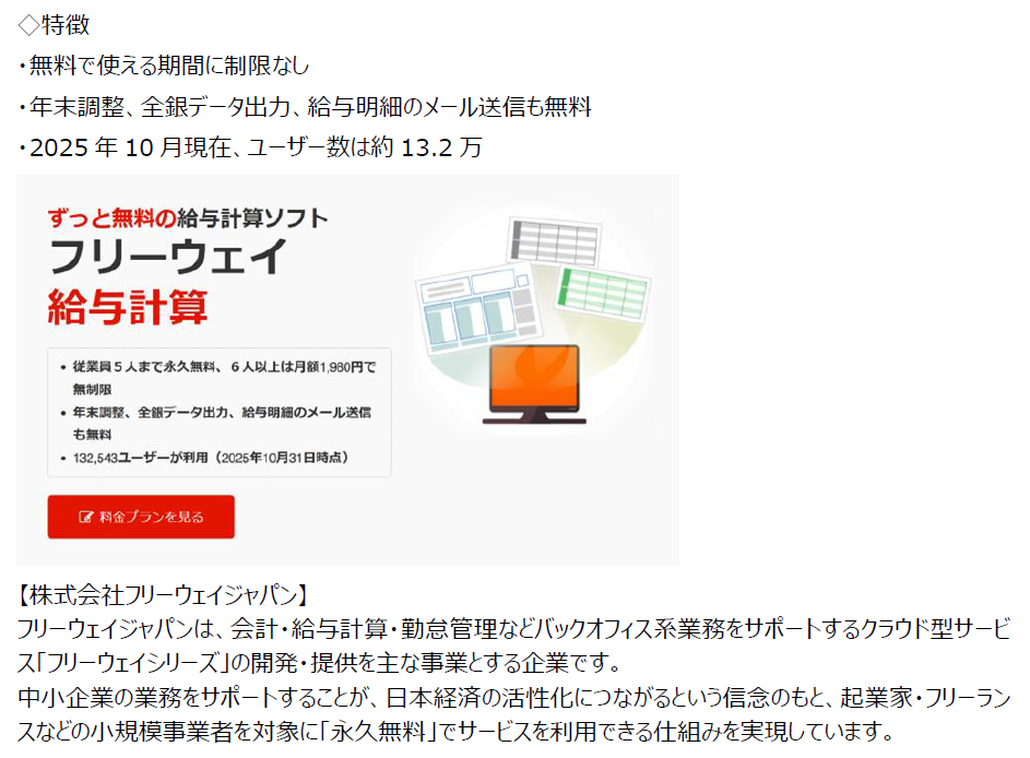 フリーウェイ給与計算は、5人まで永久無料、6人以上(無制限)は月額1,980円でご利用いただける給与計算ソフトです。