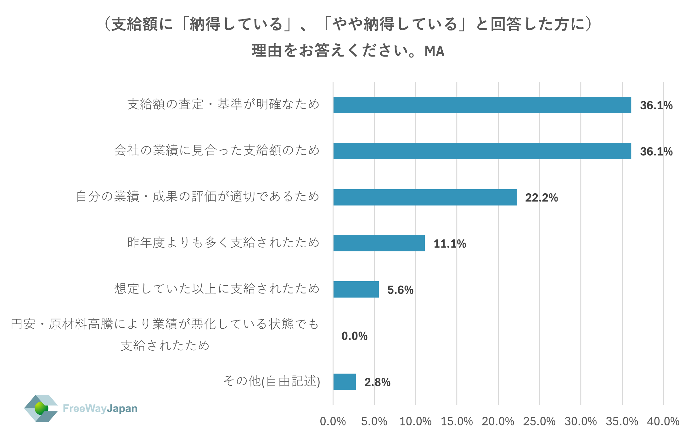 上記で「納得している」、「やや納得している」と回答した方に、理由を聞いたところ、「支給額の査定・基準が明確なため」「会社の業績に見合った支給額のため」がそれぞれ36.1%、「自分の業績・成果の評価が適切であるため」が22.2%、「昨年度よりも多く支給されたため」が11.1%、「想定していた以上に支給されたため」が5.6%、その他(自由記述)が2.8%という結果だった。