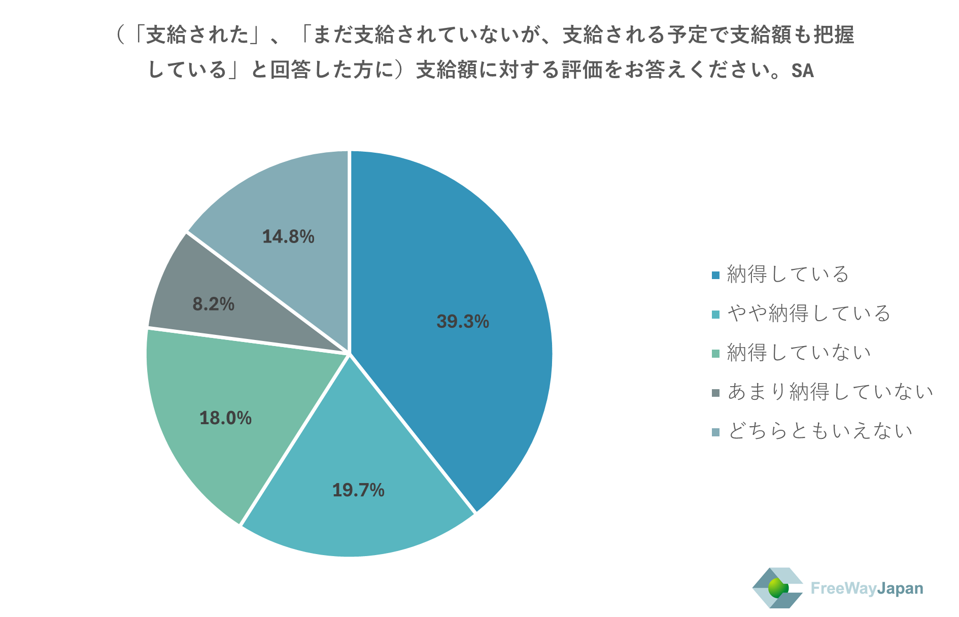 「支給された」、「まだ支給されていないが、支給される予定で支給額も把握している」と回答した方に、支給額に対する評価を聞いたところ、「納得している」が39.3%、「やや納得している」が19.7%、「納得していない」が18.0%、「どちらともいえない」が14.8%、「あまり納得していない」が8.2%という結果だった。
