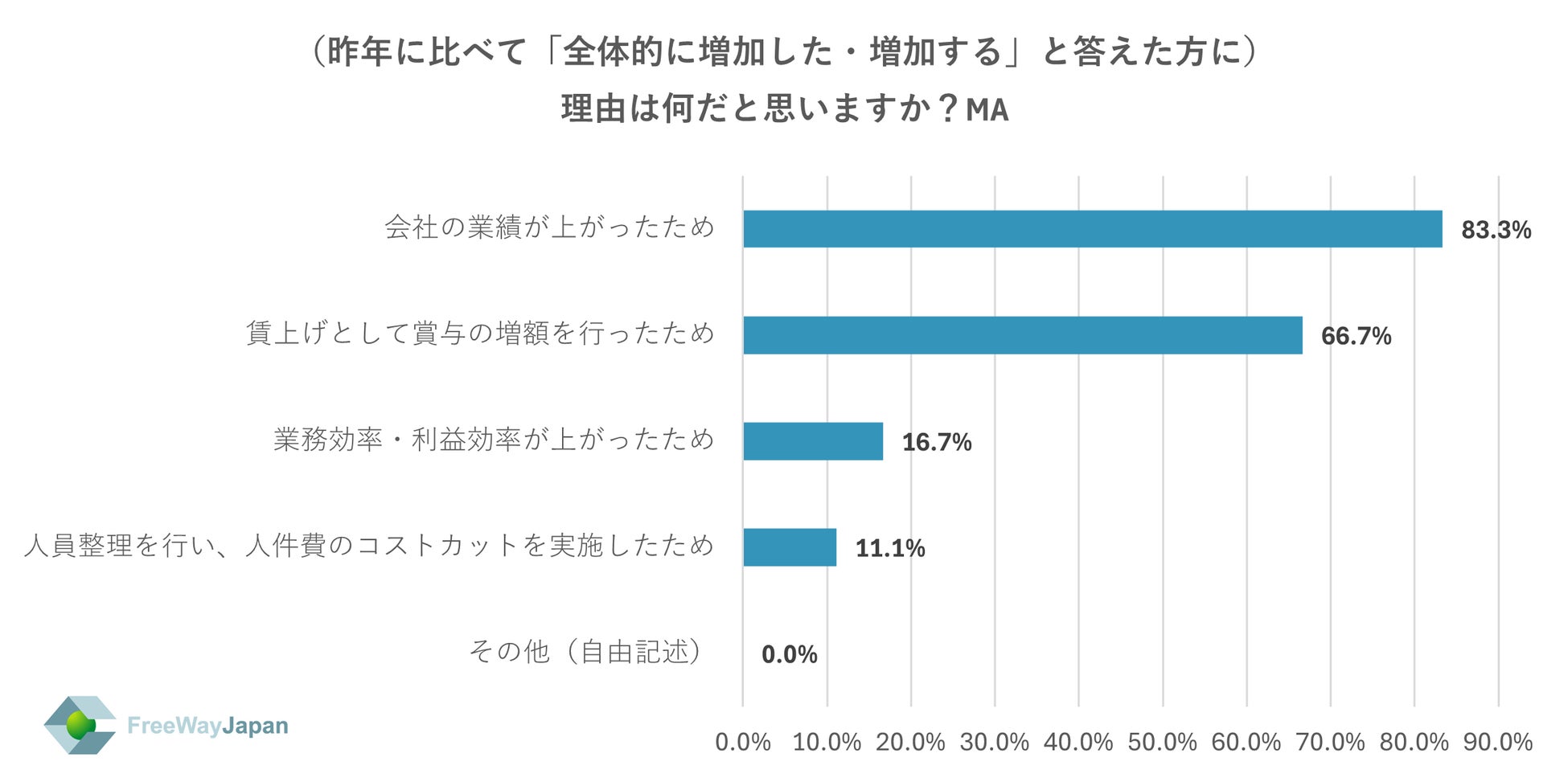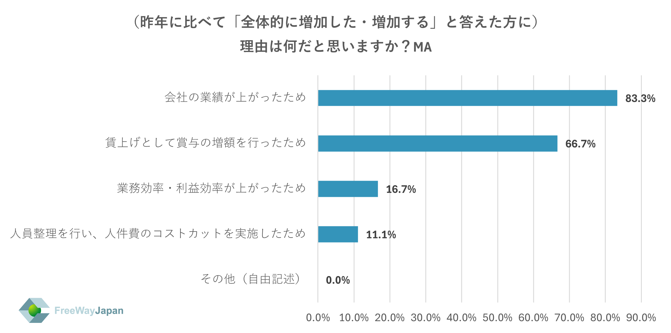 また、上記で「全体的に増加した・増加する」と答えた方に、理由は何だと思うか聞いたところ、「会社の業績が上がったため」が83.3%、「賃上げとして賞与の増額を行ったため」が66.7%、「業務効率・利益効率が上がったため」が16.7%、「人員整理を行い、人件費のコストカットを実施したため」が11.1%という結果だった。