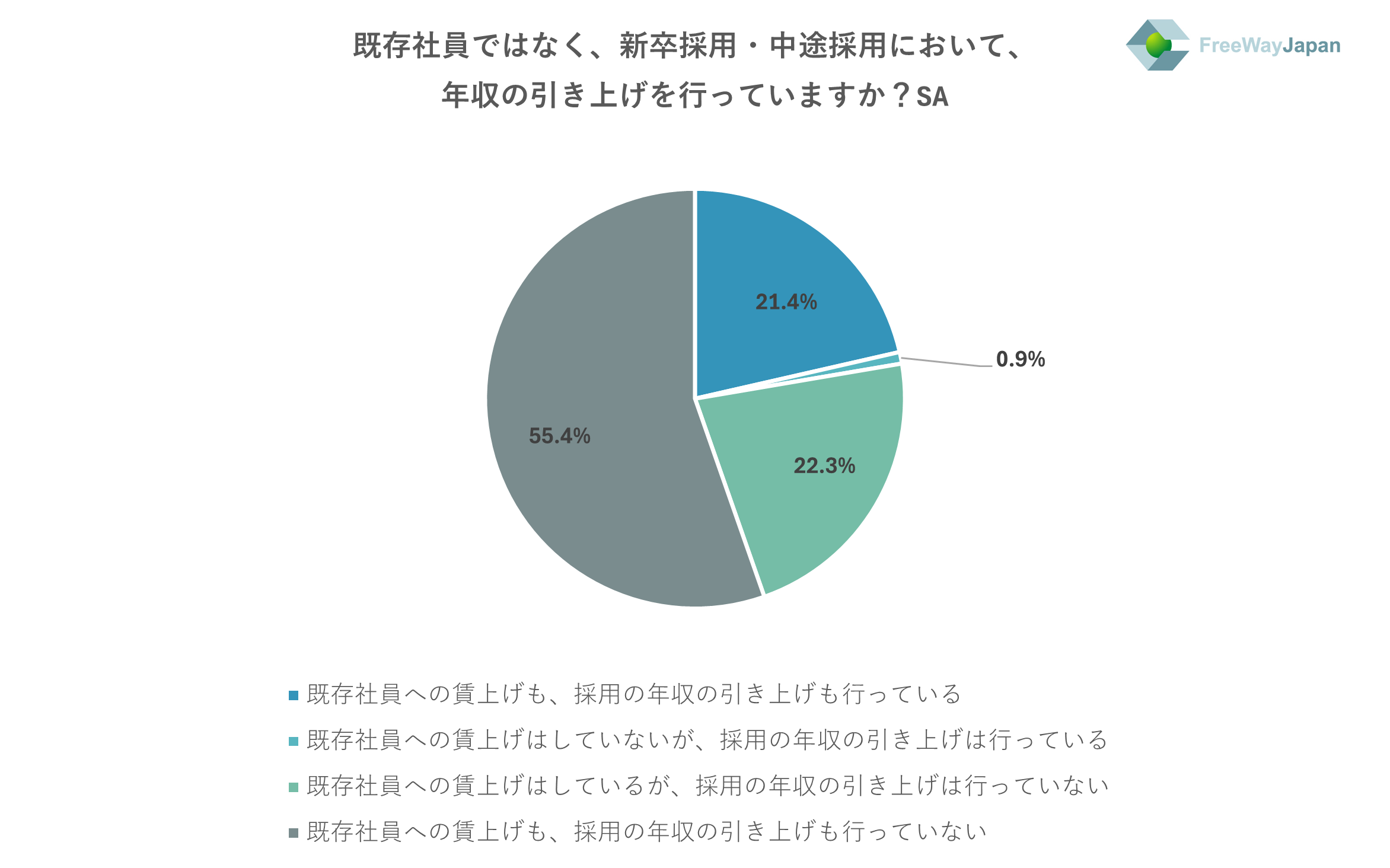 代表取締役の方に、既存社員ではなく、新卒採用・中途採用において年収の引き上げを行っているか聞いたところ、「既存社員への賃上げも、採用の年収の引き上げも行っていない」が55.4%、「既存社員への賃上げはしているが、採用の年収の引き上げは行っていない」が22.3%、「既存社員への賃上げも、採用の年収の引き上げも行っている」が21.4%、「既存社員への賃上げはしていないが、採用の年収の引き上げは行っている」が0.9%という結果だった。