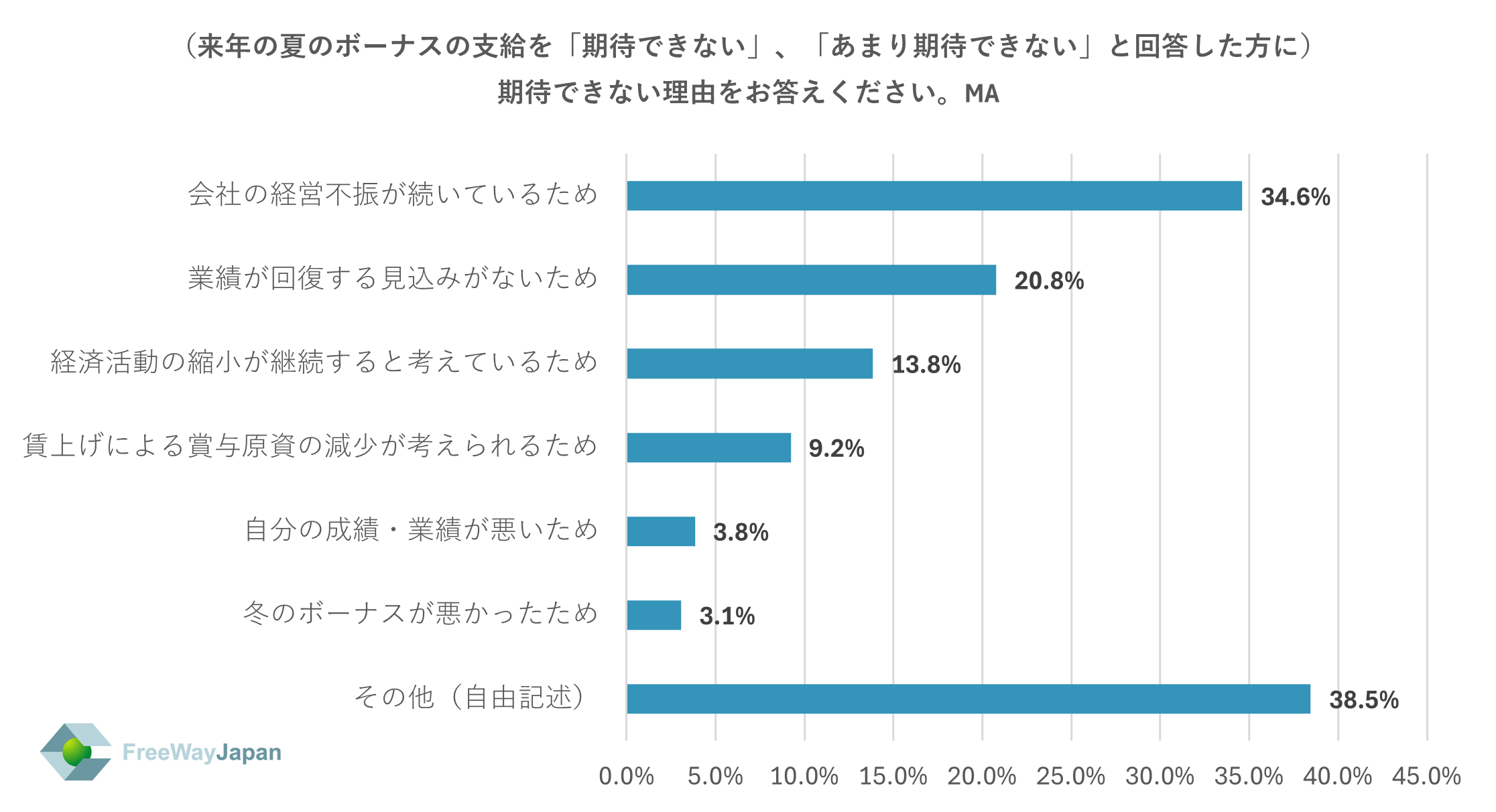 また「期待できない」、「あまり期待できない」と回答した方に、期待できない理由を聞いたところ、「会社の経営不振が続いているため」が34.6%、「業績が回復する見込みがないため」が20.8%、「経済活動の縮小が継続すると考えているため」が13.8%、「賃上げによる賞与原資の減少が考えられるため」が9.2%、「自分の成績・業績が悪いため」が3.8%、「冬のボーナスが悪かったため」が3.1%、その他(自由記述)が38.5%という結果だった。