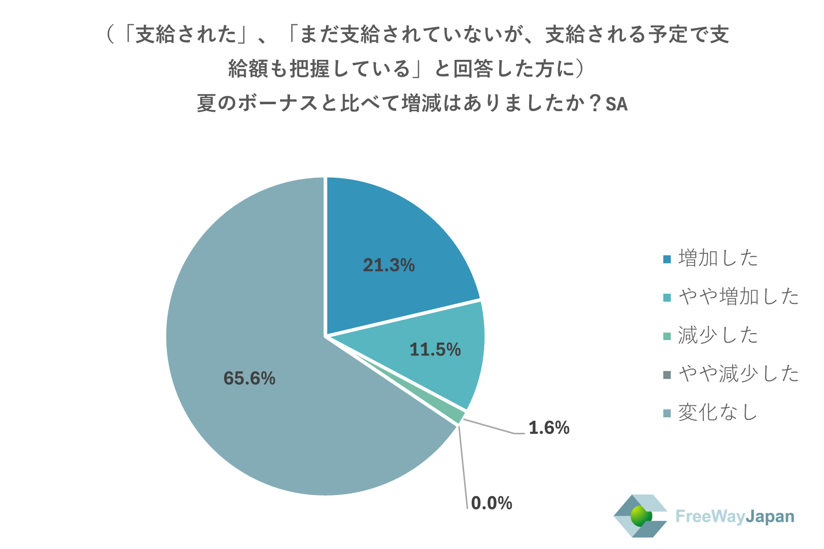 「支給された」、「まだ支給されていないが、支給される予定で支給額も把握している」と回答した方に、夏のボーナスと比べて増減はあったか聞いたところ、「変化なし」が65.6%、「増加した」が21.3%、「やや増加した」が11.5%、「減少した」が1.6%という結果だった。