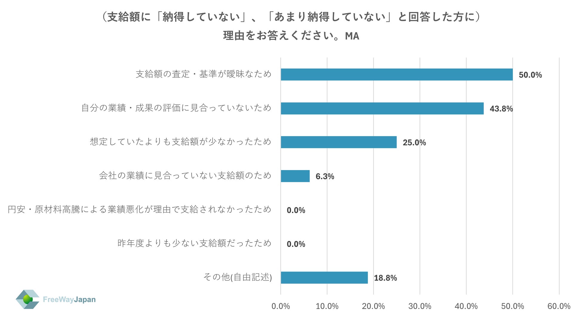 また、「納得していない」、「あまり納得していない」と回答した方にも理由を聞いたところ、「支給額の査定・基準が曖昧なため」が50.0%、「自分の業績・成果の評価に見合っていないため」が43.8%、「想定していたよりも支給額が少なかったため」が25.0%、「会社の業績に見合っていない支給額のため」が6.3%、その他(自由記述)が18.8%という結果だった。