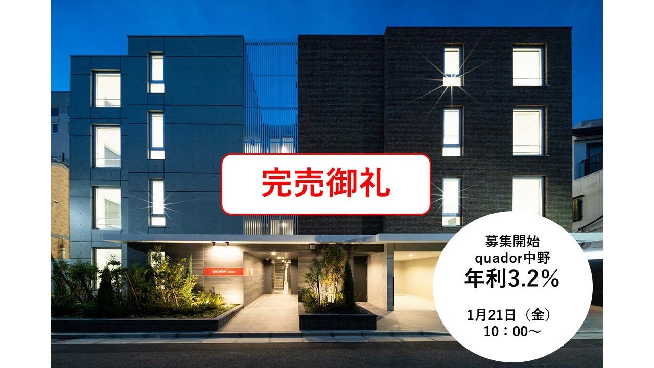 株式会社リビングコーポレーションの不動産クラウドファンディングサイト「property+/プロパティプラス」にて、本年1月21日に募集を開始した「quador中野ファンド3」(募集金額1億1,980万円)が完売いたしました。