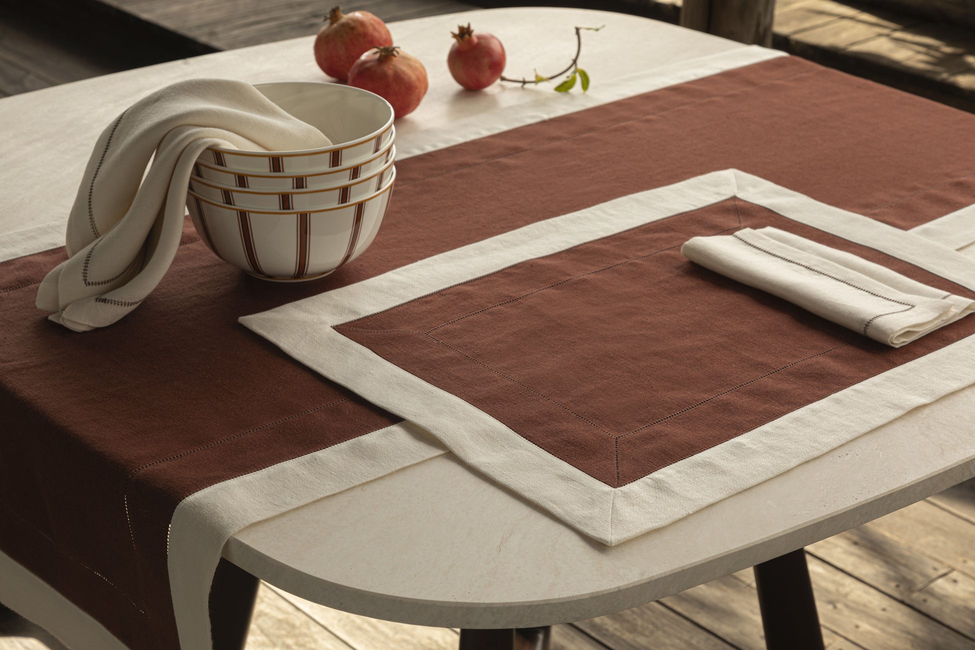 ロロ・ピアーナ・インテリアのテーブルには、ランナーやインフォーマルなプレースマット、またはクラシックなリネンのテーブルクロス(伝統的または斜めに配したもの)があり、透かし彫りや刺繍、コントラストを効かせた縁取りで華を添えます。リネンサテンのナプキンにも透かし模様が施されています。