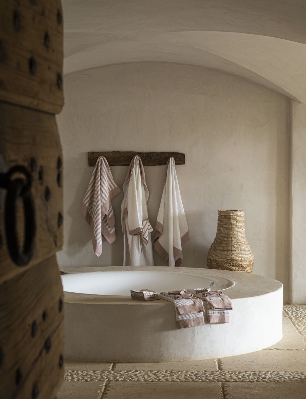 最後に、バスとスパゾーンには、ふっくらとしたソフトハニカム、カシミヤタッチのコットン・ピケ、コットンとカシミヤのシェニール織りのサブレのバリエーションがあり、どちらも同じ縁取りを備えています。白地に無地、ストライプ、カラーピンストライプのラインナップで、3サイズのコーディネートされたバスローブ、タオル、バスシーツのほか、手ぬぐい、お揃いのプールタオルとクッションが付いたスパとプールのセットが揃います。