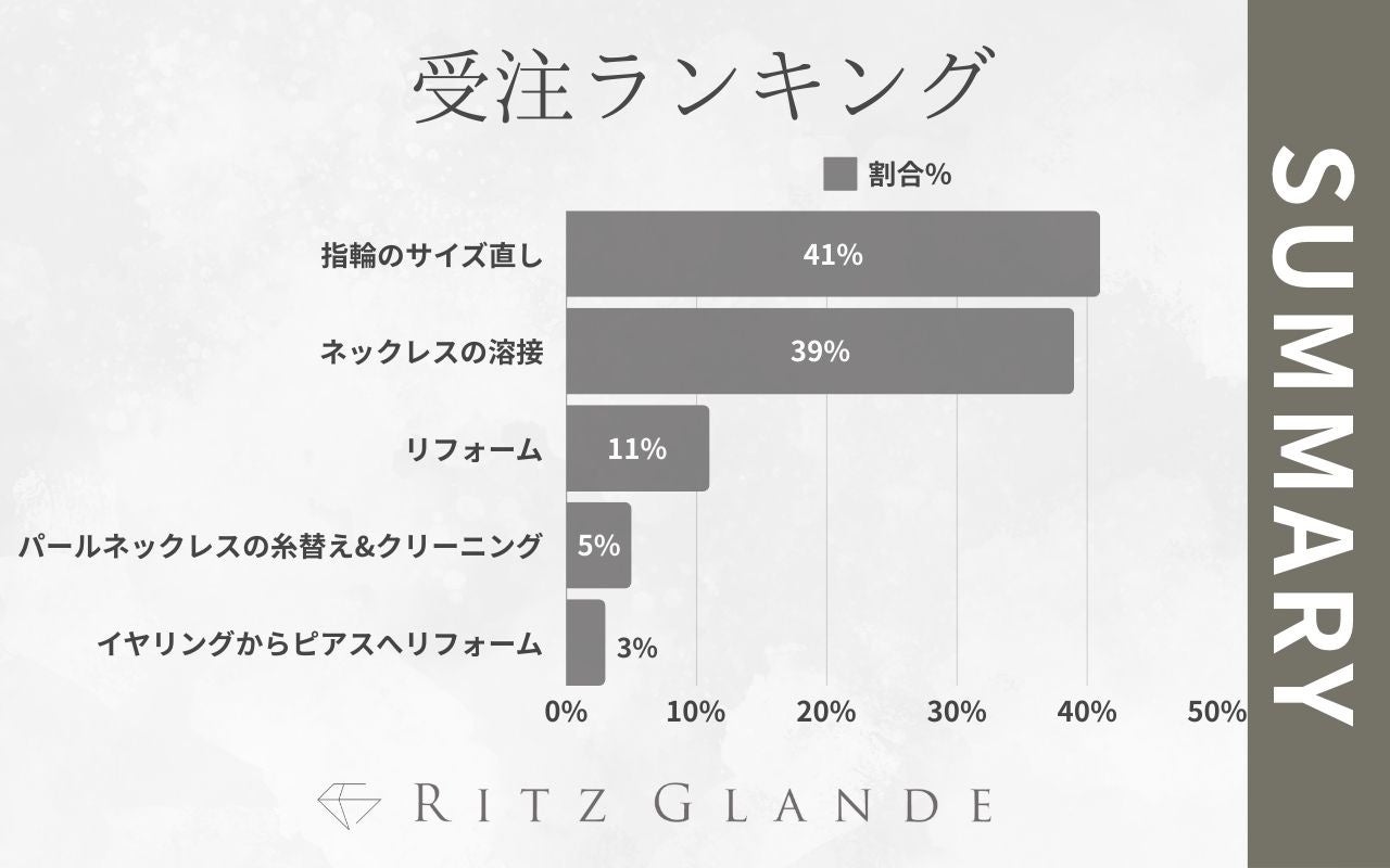 指輪のサイズ直しとネックレスの溶接で全体の80%を占めており、これらの修理への顧客ニーズの高さが浮き彫りになりました。
