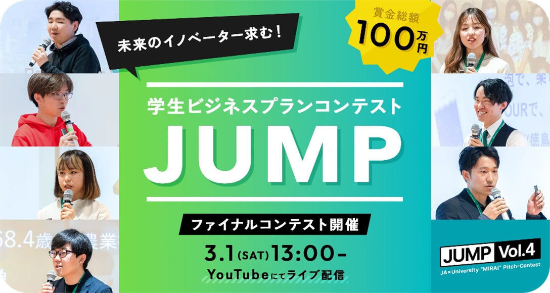 AgVenture Labが、社会課題解決に向けたビジネスの起業・事業拡大を目指す学生のサポートを目的に開催する全国規模のピッチコンテスト。「JA×University “MIRAI” Pitch-contest」の頭文字からJUMPと名付けた。