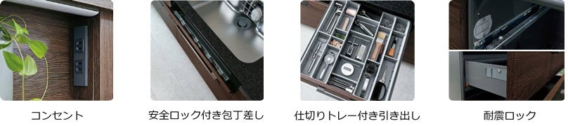 一条工務店の「グレイスキッチン」は、高いデザイン性による 見た目の美しさだけでなく、フルスライドで奥まで無駄なくスペースを活用できる大容量収納で、使いやすさも兼ね備えて います。お鍋などの調理器具から、大小様々な食器、必要な調味料まで、必要なものがすぐ手に取れるよう、引き出し内部も工夫 。安全性にも配慮し、耐震ロックや安全ロック付き包丁差しなどを取り入れています。