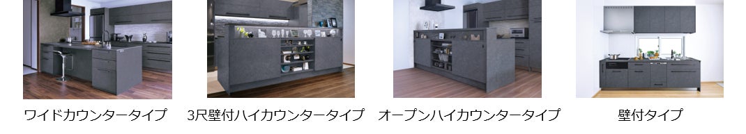 今回、美と機能が調和する「グレイスキッチン」に、近年人気が高まっている黒を基調とした、待望の新色「ナイトストーン」を追加します。シックで落ち着いた色合いで空間全体を引き締め、日々の料理の時間をスタイリッシュに演出します。さらに、キッチン本体に加えて、水栓やカウンター、レンジフードなどのアイテムも「ブラック」で統一することが可能。高級感のある洗練された空間を創り出します。キッチンカウンターのタイプはライフスタイルによって、全4種類の中からお選びいただけます。