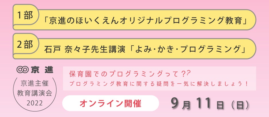 全国で95園のほいくえん、ようちえん、こどもえんを運営する京進グループでは、9月11日(日)に、プログラミング教育に関する教育講演会をオンラインで開催いたします。子どもたちのデジタル教育やメディアとの関わり方などに精通する、株式会社CANVAS代表取締役CEO・慶應義塾大学大学院メディアデザイン研究科教授 石戸 奈々子さんを講師に招き、プログラミングに関する疑問への回答などをお話いただきます。参加料は無料です。