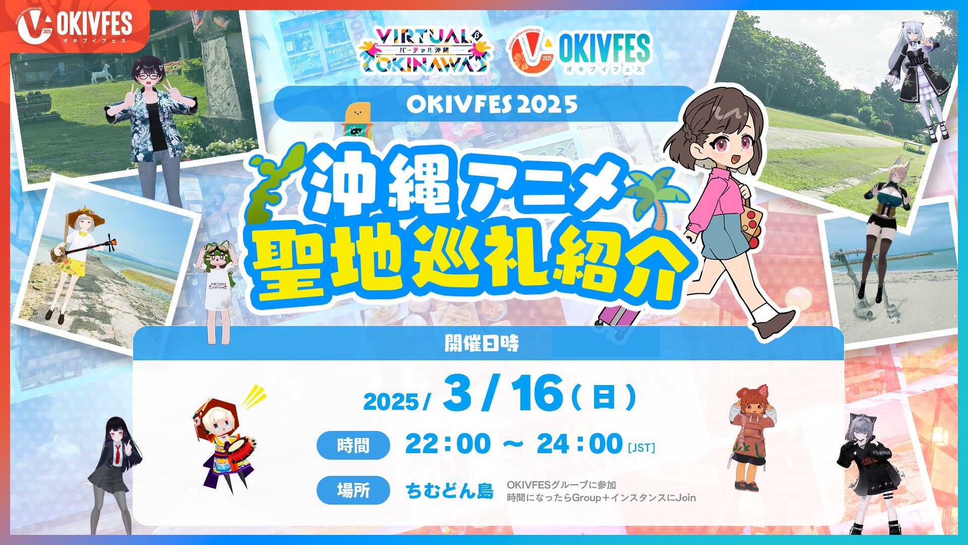 本イベントでは、沖縄を舞台にした作品や、沖縄の風景が登場するシーンをピックアップし、実際のロケ地や背景のモデルとなったスポットを紹介します。VRC沖縄集会メンバーが案内するバーチャル聖地巡礼で、作品と現実が交差する瞬間を体験してください。