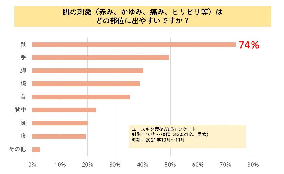 ユースキン製薬が、10代~70代の方62,031名に実施したWEBアンケートによると、敏感肌の特有な「赤み」「かゆみ」「痛み」「ピリピリ」といった症状は、約7割の方が顔に感じていることが分かりました。