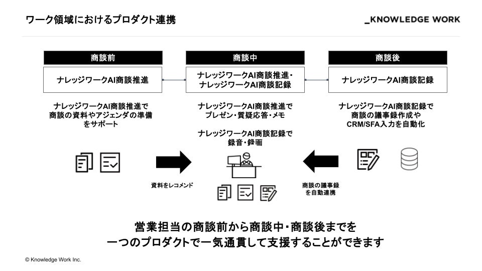 ナレッジワークはこれまで、商談前の準備を支援するプロダクトを展開してきましたが、今回の「ナレッジワークAI商談記録」の提供により、商談後の記録の支援も開始します。プロダクトを相互に連携させ、営業担当の商談前から商談中・商談後までを一つのプロダクトで一気通貫して支援します。