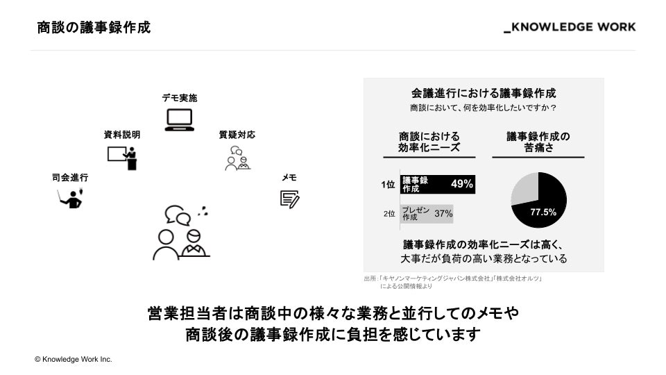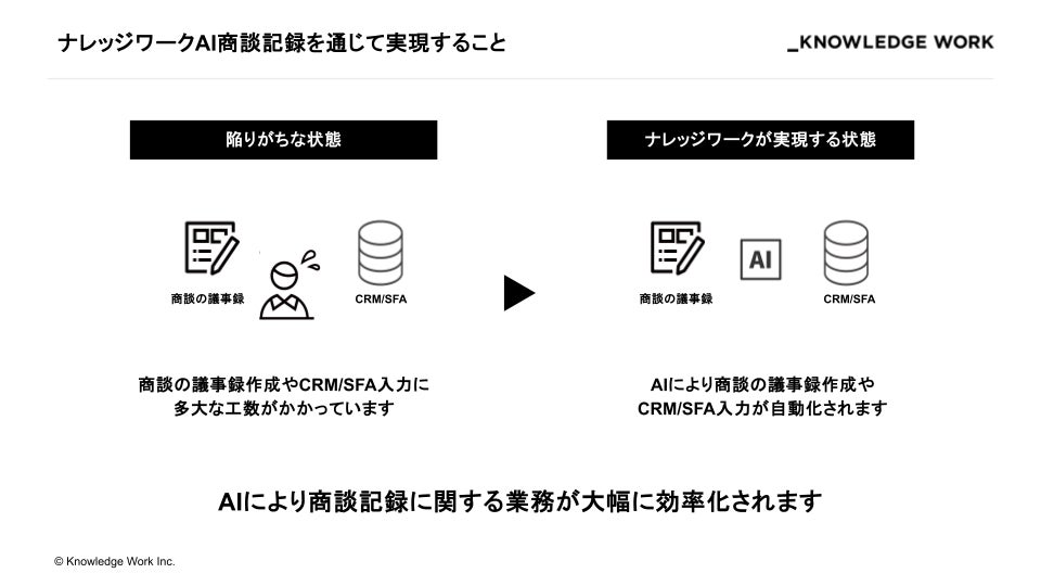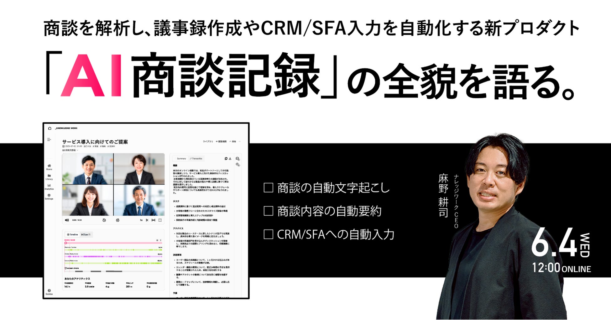 「できる喜びが巡る日々を届ける」をミッションに掲げる株式会社ナレッジワーク(本社:東京都港区、CEO 麻野耕司)は、AIの力でオンライン・オフラインの商談の議事録作成やCRM/SFA入力を自動化する新プロダクト「ナレッジワークAI商談記録」をリリースいたします。