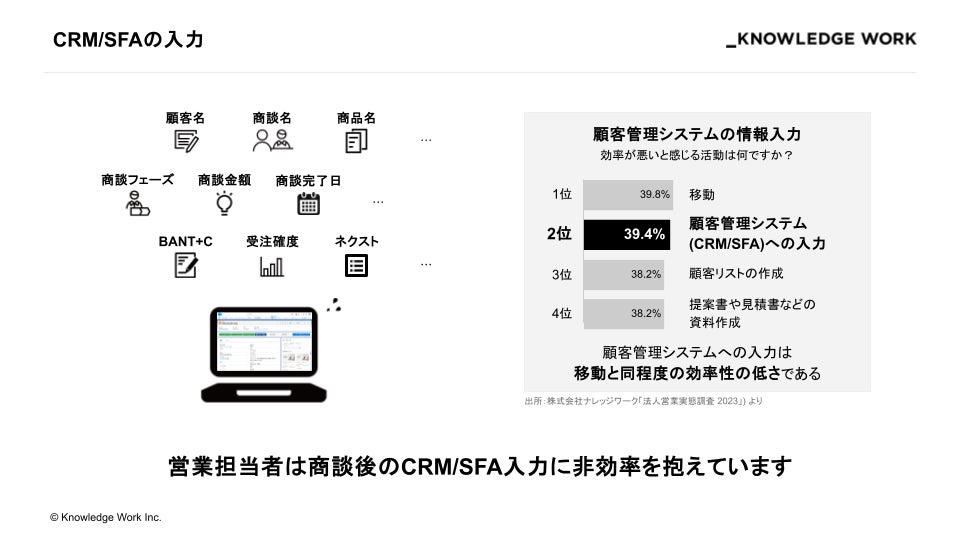 営業現場では、商談後の議事録作成やCRM/SFAへの入力といった記録業務に多くの時間と労力が割かれ、本来注力すべき顧客対応から時間を奪う要因になっています。またその手間から記録業務は組織的に徹底されないことが多く、昨今多くの企業が力を入れている商談データの蓄積や、そのデータを基盤にした組織の営業力強化は道半ばとなっているケースが頻繁に見られます。