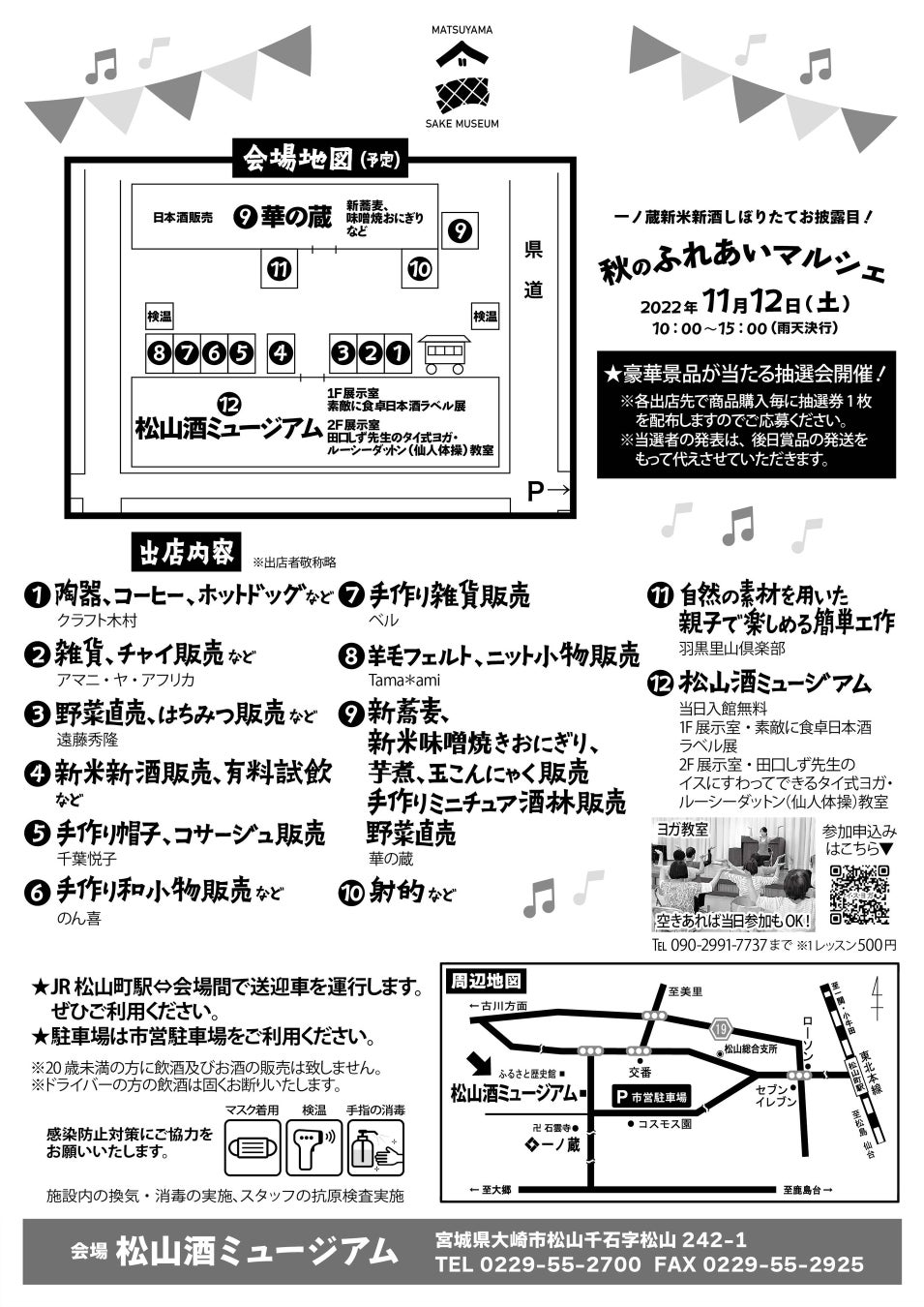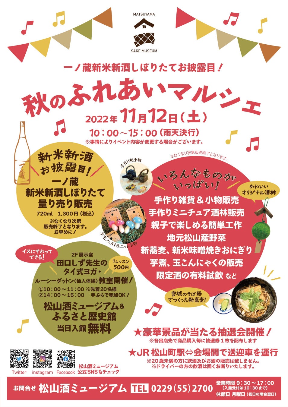 11月12日(土)松山酒ミュージアムにて開催。一ノ蔵の新米新酒本醸造しぼりたてのお披露の他、新蕎麦、手作り小物の販売、ゲームコーナー、ヨガ教室など盛り沢山のイベントです。