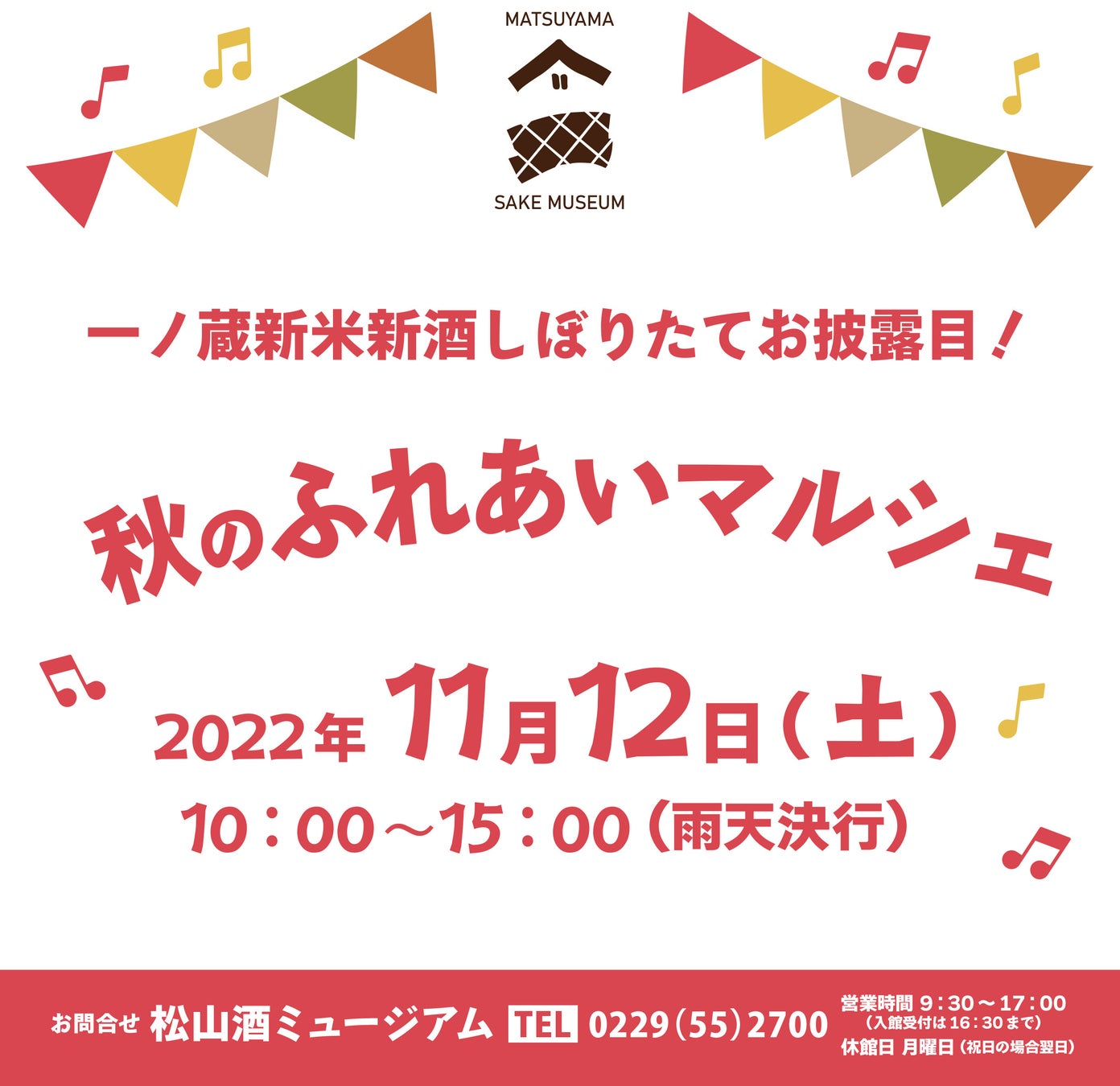 11月12日土曜日、大崎市松山酒ミュージアムにて『一ノ蔵新米新酒しぼりたてお披露目!秋のふれあいマルシェ』を開催いたします。
