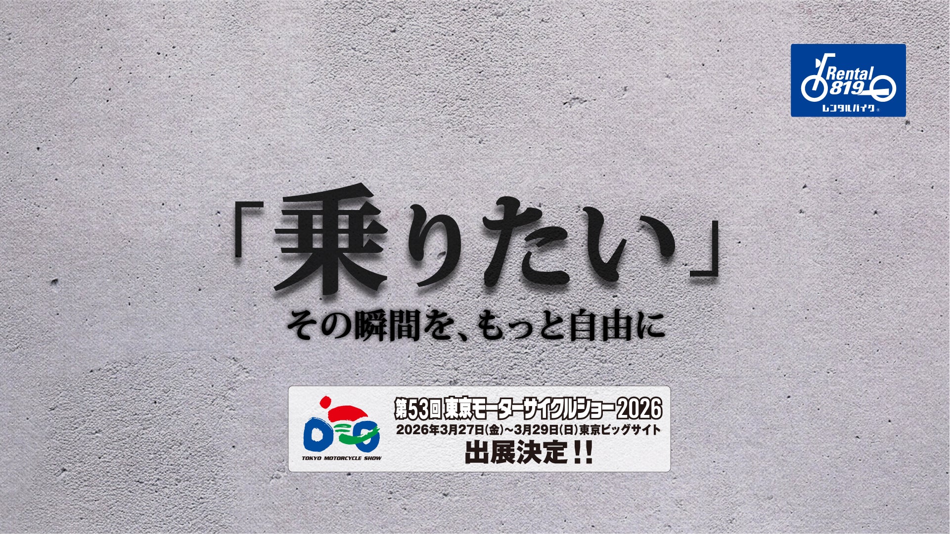株式会社キズキレンタルサービス(本社:埼玉県川口市)が展開する全国レンタルバイクサービス「レンタル819」は、第53回 東京モーターサイクルショー2026(会期:2026年3月27日(金)〜29日(日)/会場:東京ビッグサイト 西ホール)に出展します。