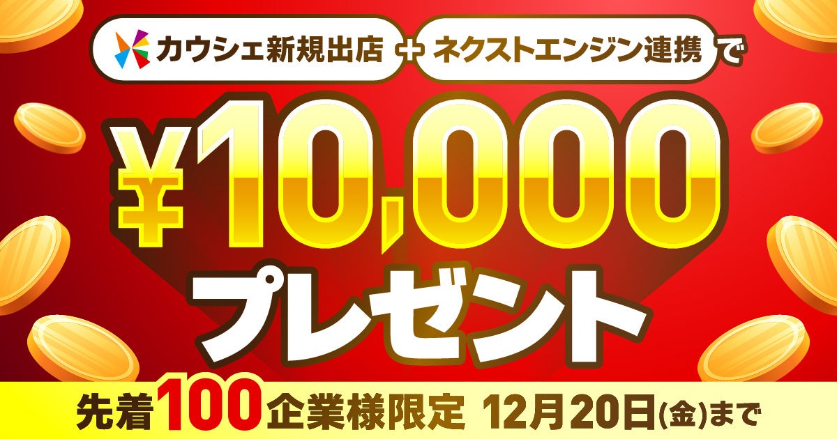 期間中に「カウシェ」への新規出店と「ネクストエンジン」との在庫連携を完了した先着100社に1万円をキャッシュバック